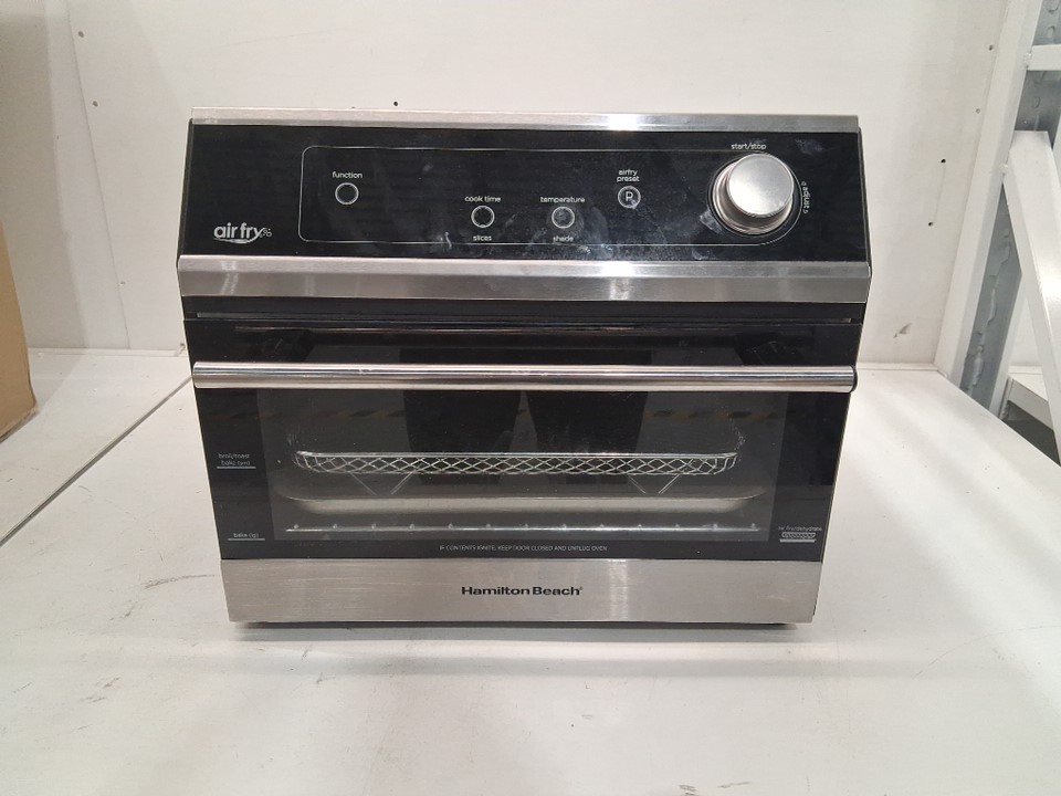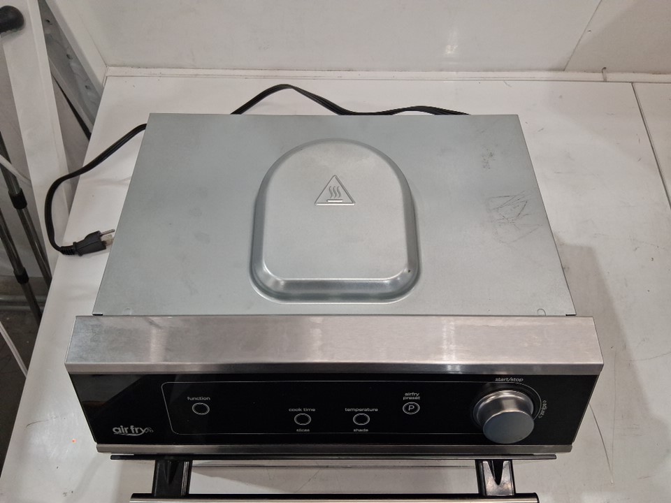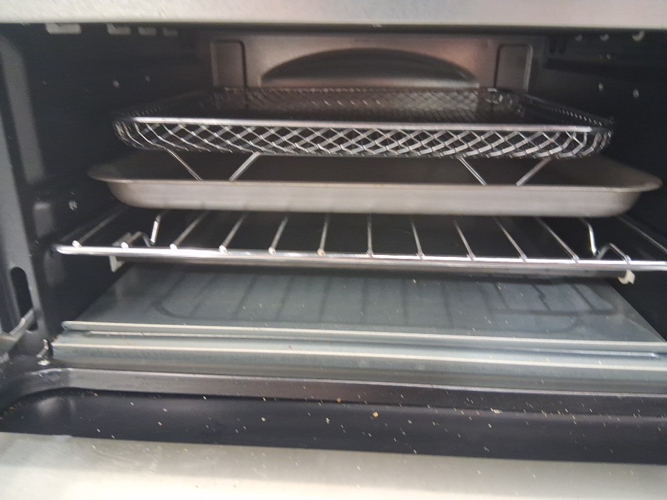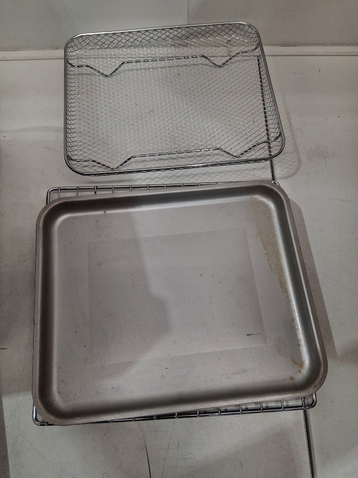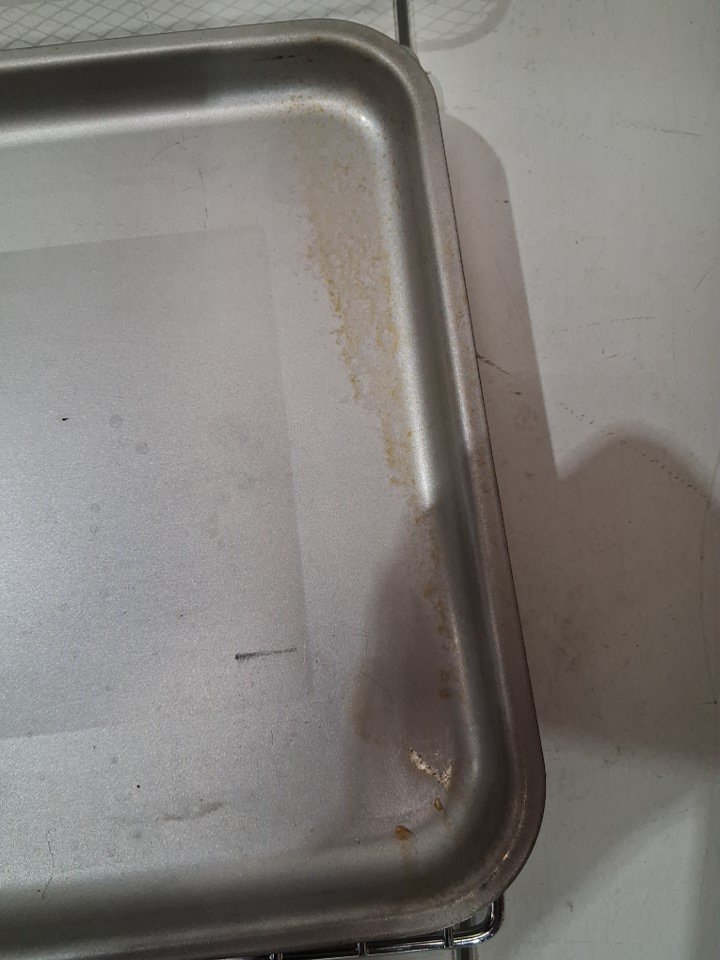 There are some crumbs and light stains on the inside of the air fryer, some food stains on the pan, and some scuffs on the top of the fryer indicating some previous use, but appears to be in good condition and function without any issues - see photos.