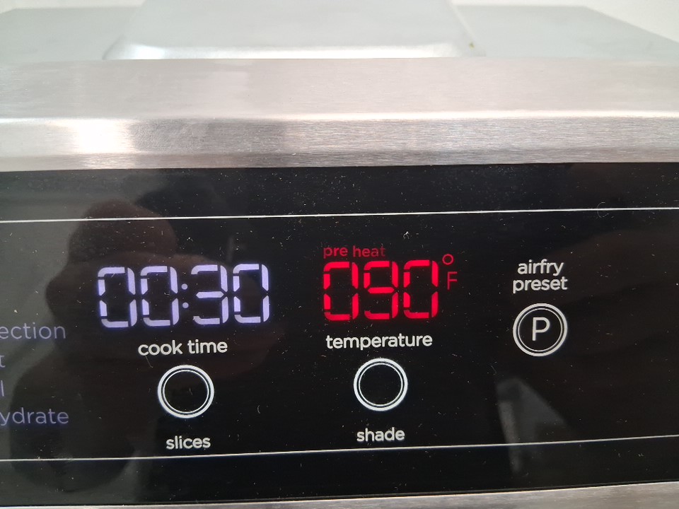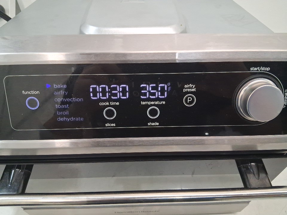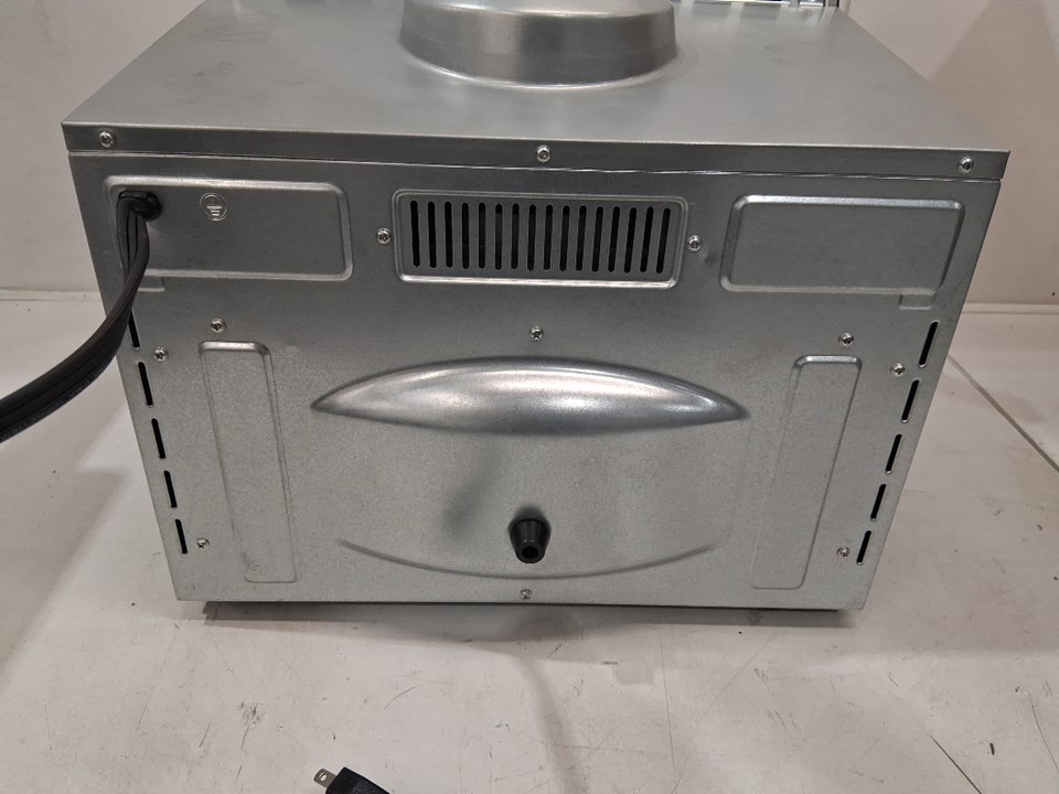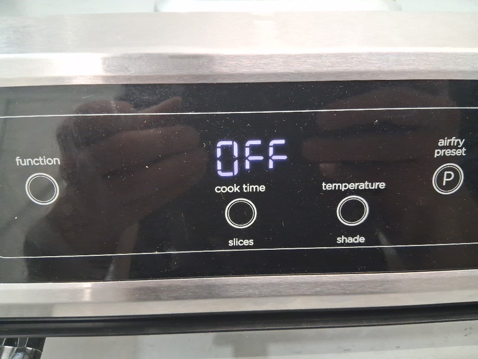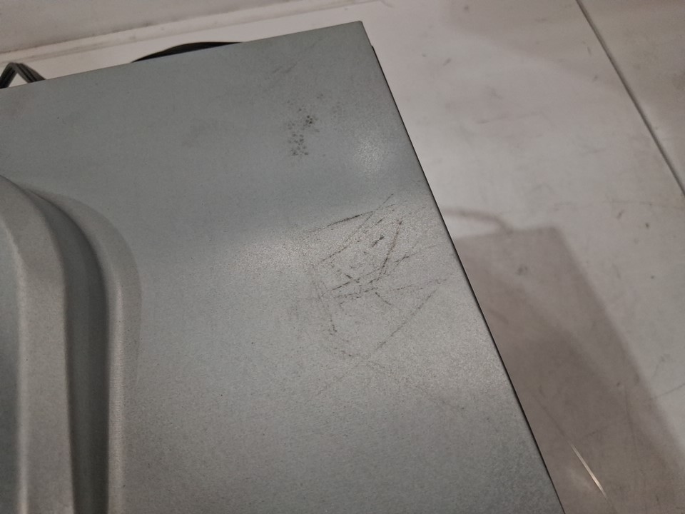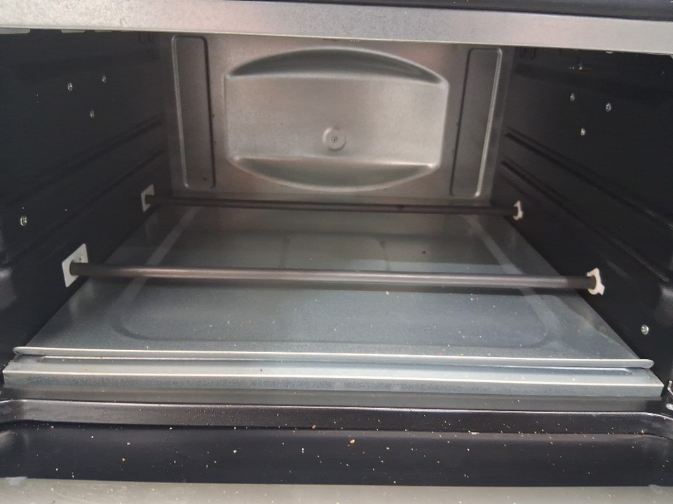 There are some crumbs and light stains on the inside of the air fryer, some food stains on the pan, and some scuffs on the top of the fryer indicating some previous use, but appears to be in good condition and function without any issues - see photos.