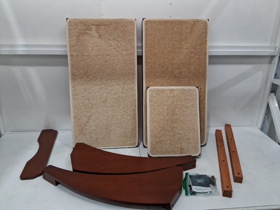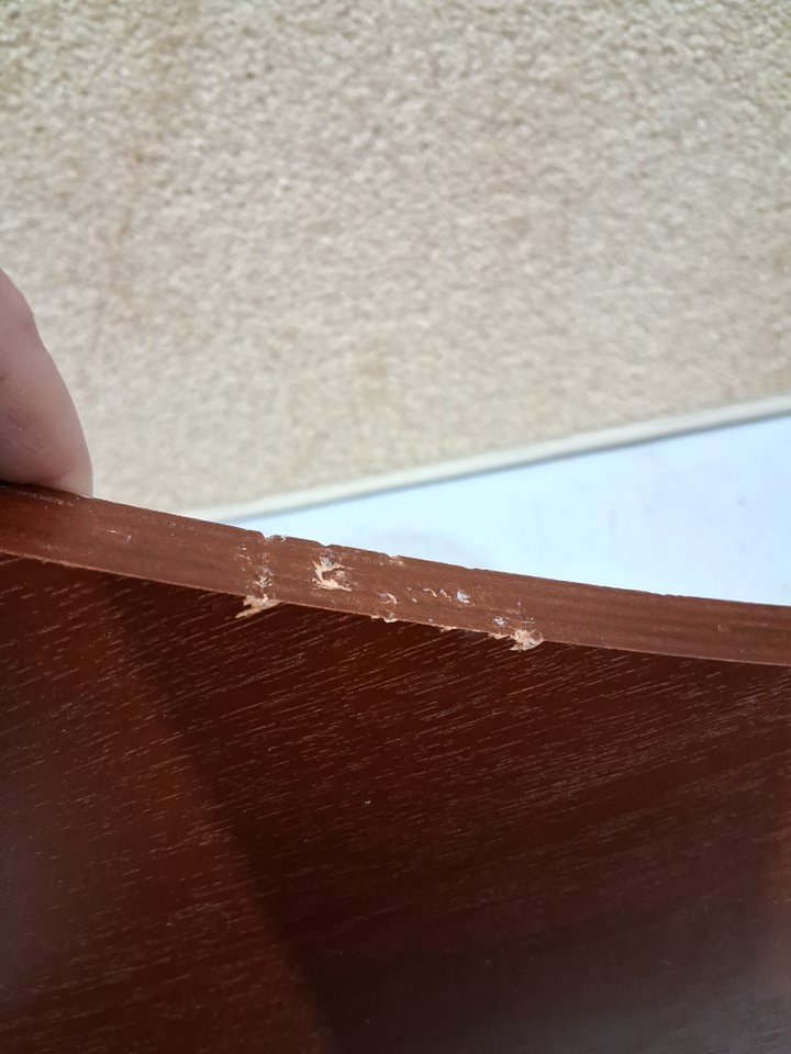 THERE IS VERY LIGHT PET HAIR IN THE CARPET AND THERE ARE SCUFFS/SCRATCHES THROUGHOUT CONSISTANT WITH PREVIOUS USE/ASSEMBLY