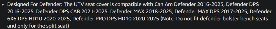 Designed For Defender: The UTV seat cover is compatible with Can Am Defender 2016-2025, Defender DPS 2016-2025, Defender DPS CAB 2021-2025, Defender MAX 2018-2025, Defender MAX DPS 2017-2025, Defender 6X6 DPS HD10 2020-2025, Defender PRO DPS HD10 2020-2025 (Note: Do not fit defender bolster bench seats and only for the split seat)