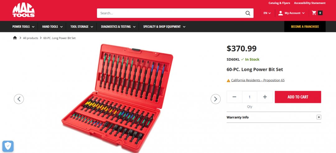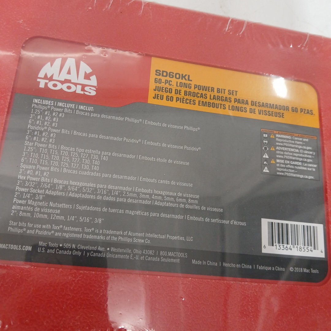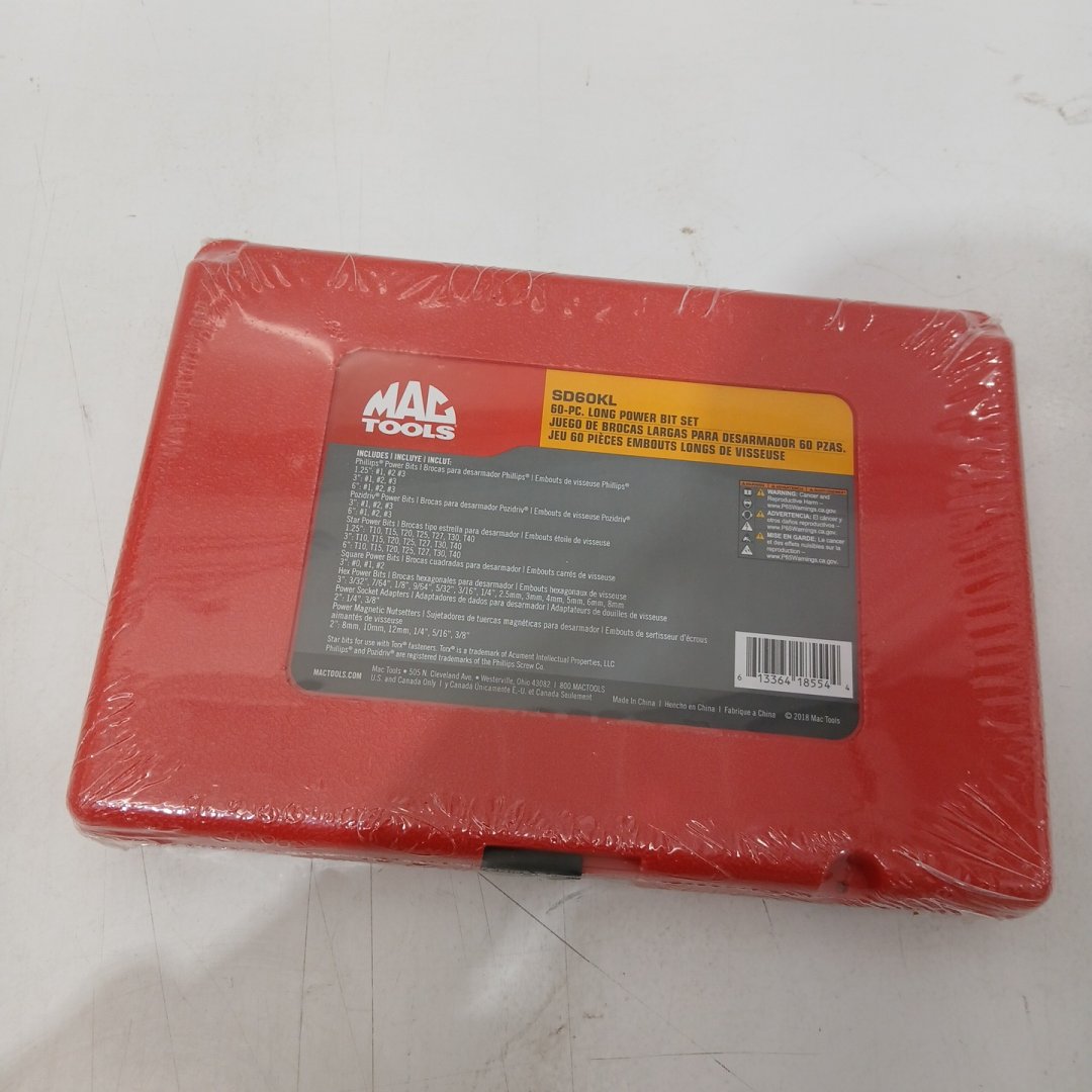 60PC MAC TOOLS LONG POWER BIT SET, INCLUDES PHILLIPS, POZIDRIV, SQUARE, HEX POWER & POWER MAGNETIC NUTSETTERS - (MODEL: SD60KL)
