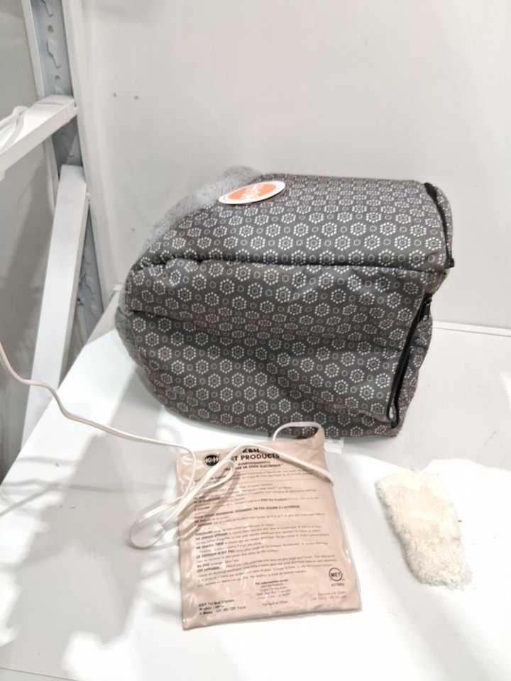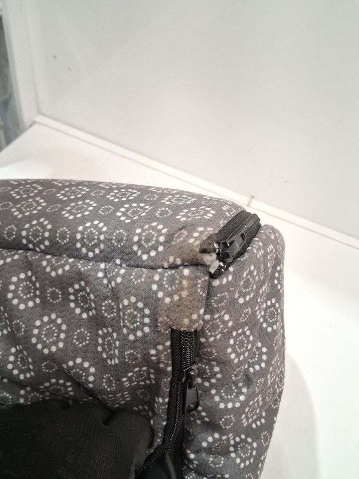 Tested for power, and found the heating pack takes a very long time to heat up then seems to stop May be on a cycle but we are calling this an issue to be safe Light loose fabric and small dirt spot, from previous use.