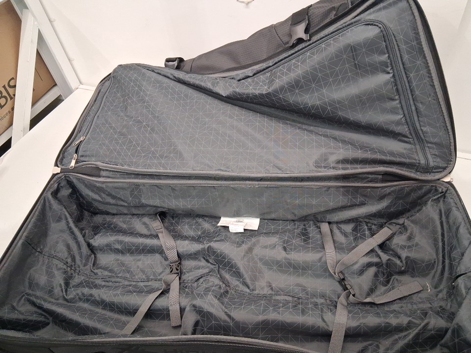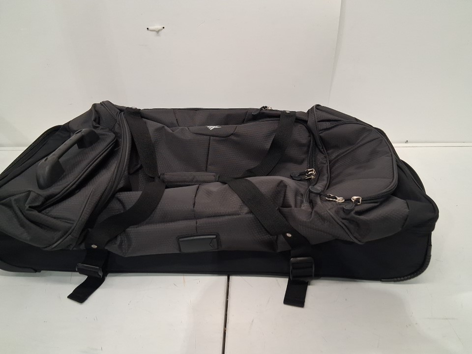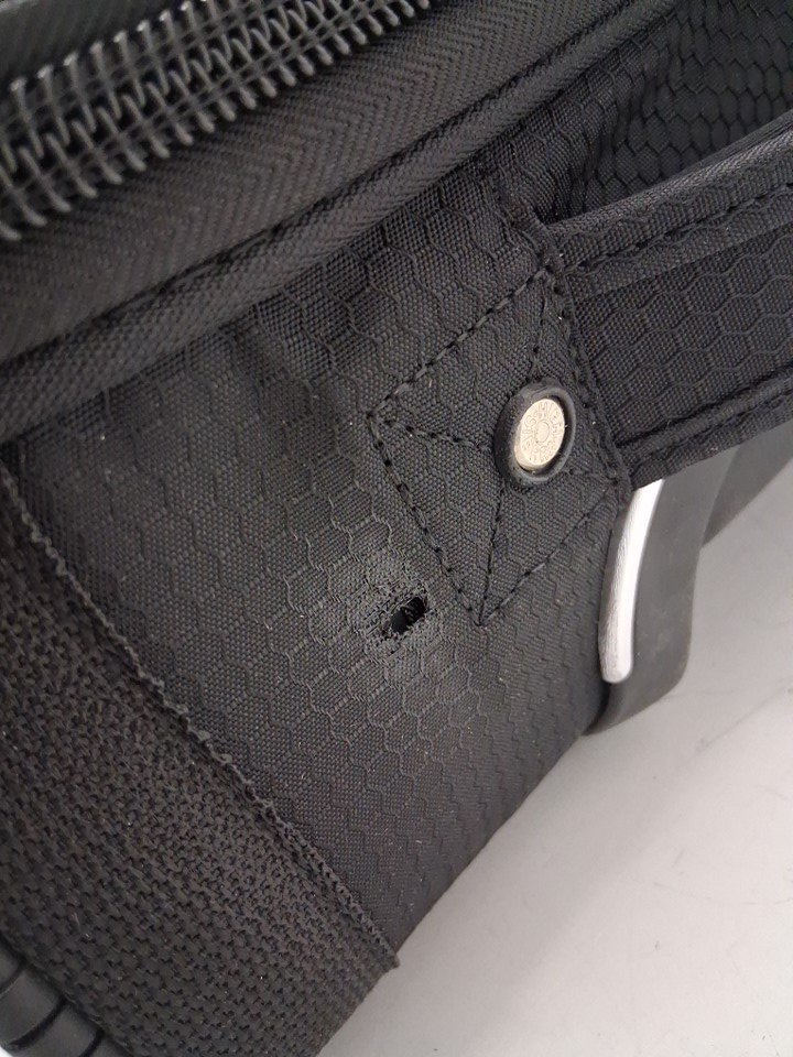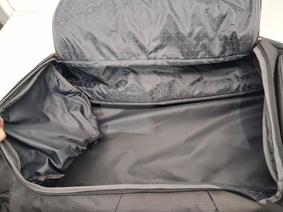 Wheels have visible dirt discoloration and there is a small tear/hole near handle