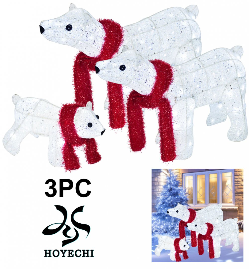 3PC hoyechi Lighted Polar Bear Family with 140 Pre-Strung Lights, White/RED (MODEL:HYC8016)