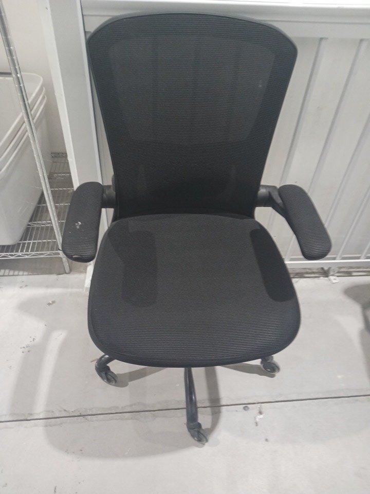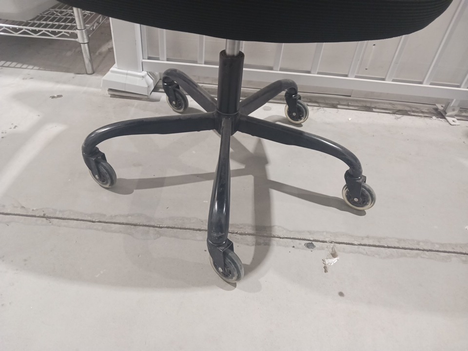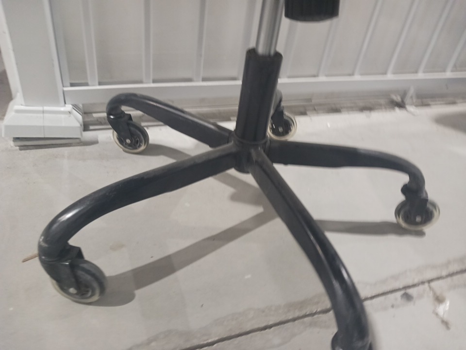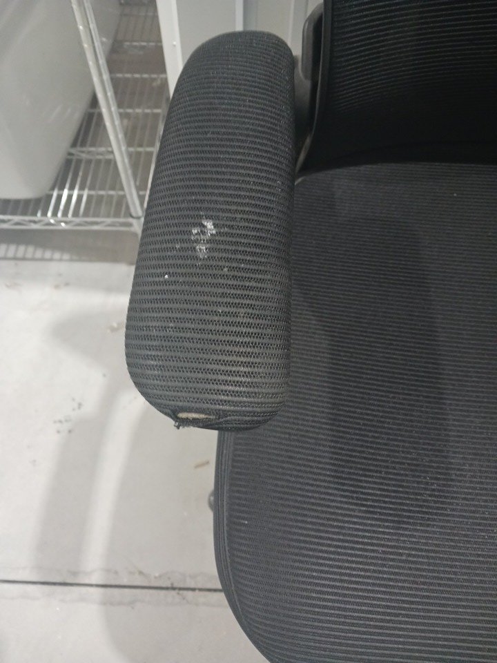 This chair was used by our staff in the facility. there is quite a bit of wear present and some scuff and marks through out. there is some rip padding on the arm and the wheels sometimes gets stuck.