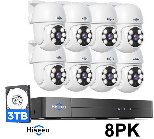 8pk Hiseeu 3K PTZ Wired Security Camera System, 360°View with Alarm Spotlight - 12v - white (model:ak-8yhd5t-ct)