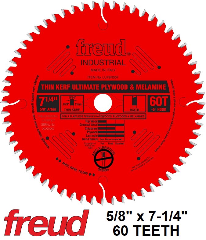 Freud Perma-Shield Coated Ultimate Plywood & Melamine Saw Blade, 5/8" Arbor , 7-1/4" by 60 TEETH Hi-ATB 38-Degree, Multi - (Model: LU79R007)