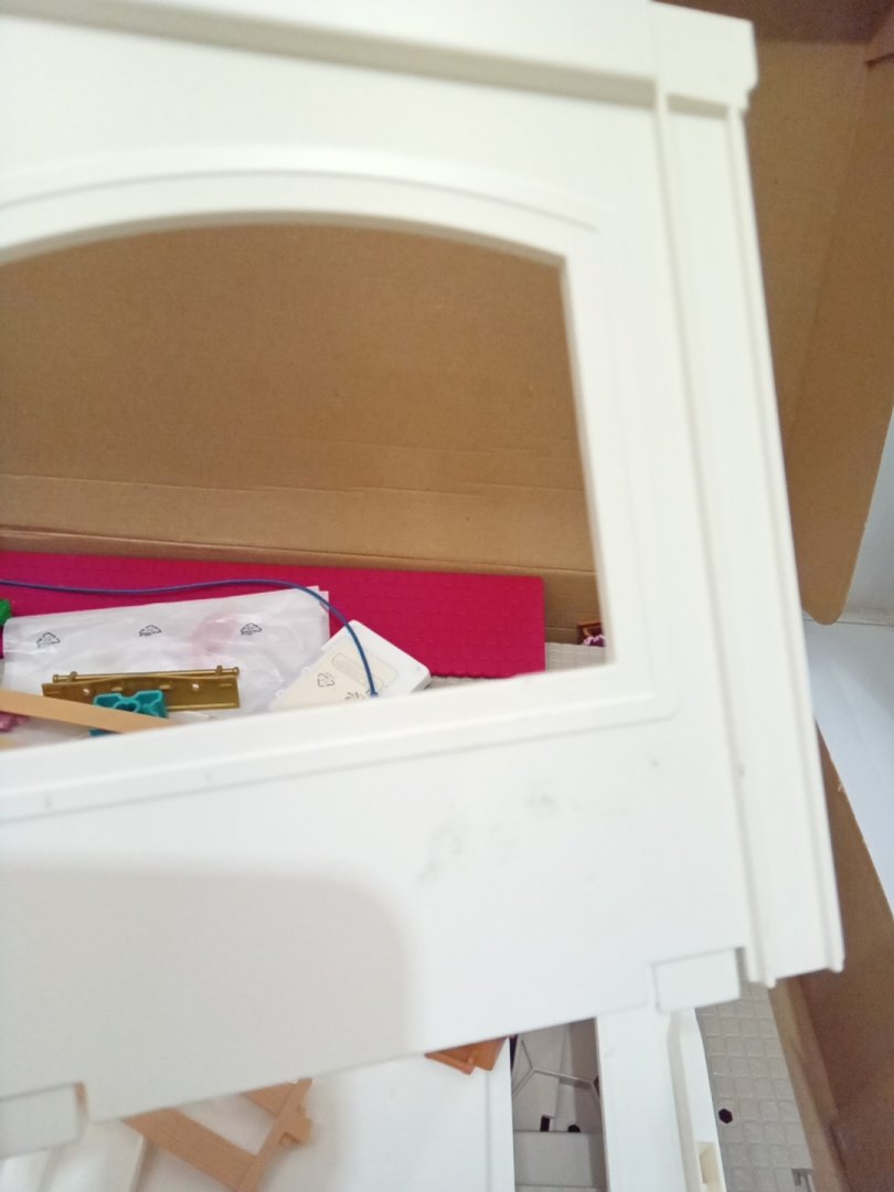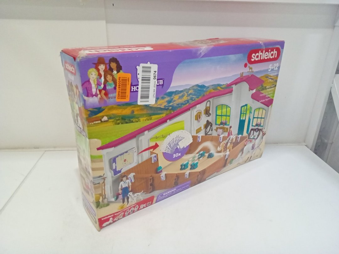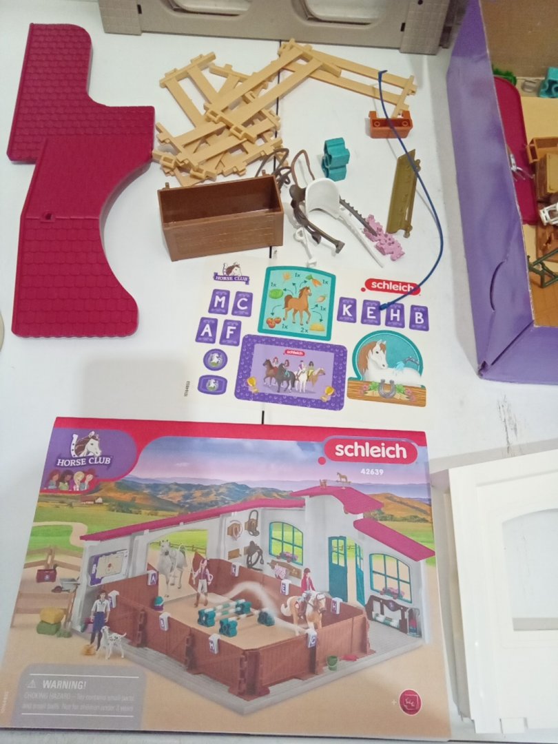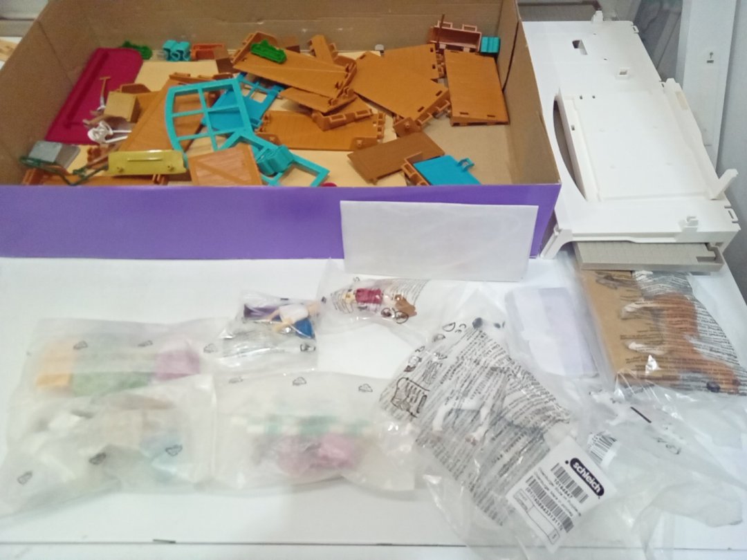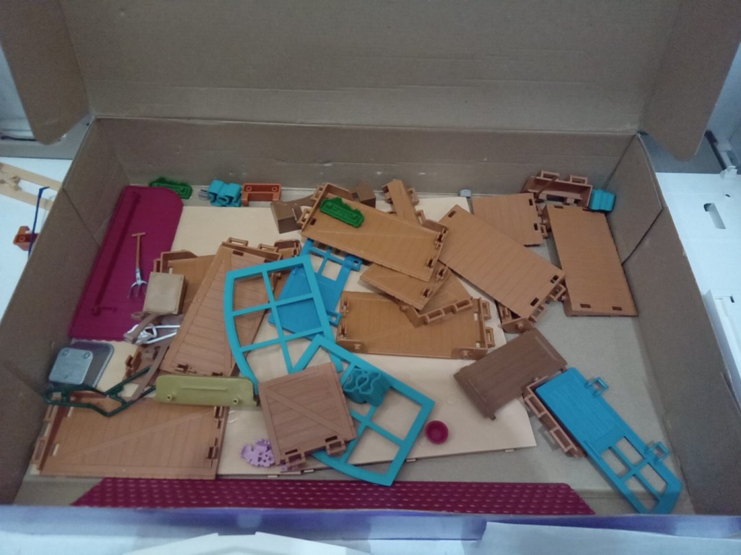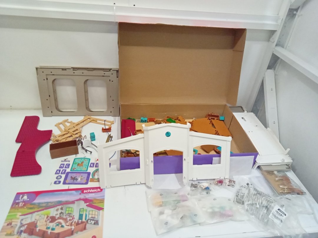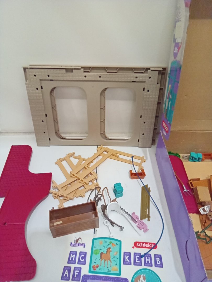 Set appears new but is missing the red-haired character and has scuffs on the doorway piece of the building. Additional parts may be replaceable from manufacturer via request form.