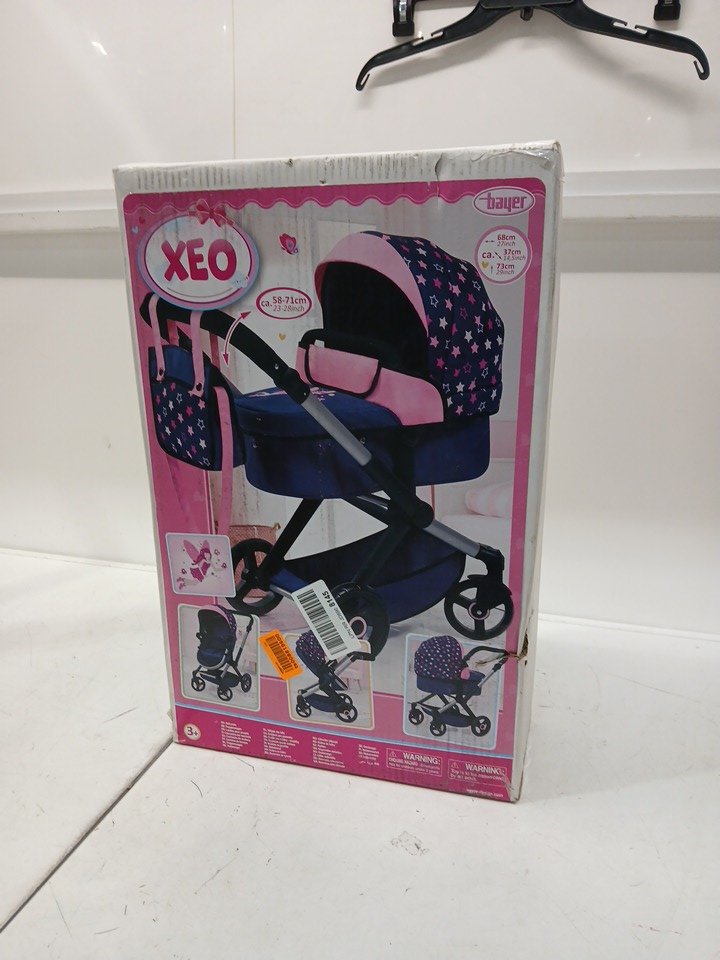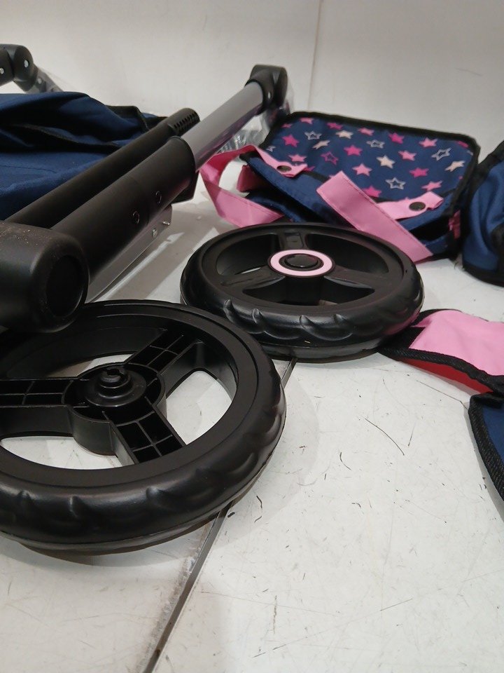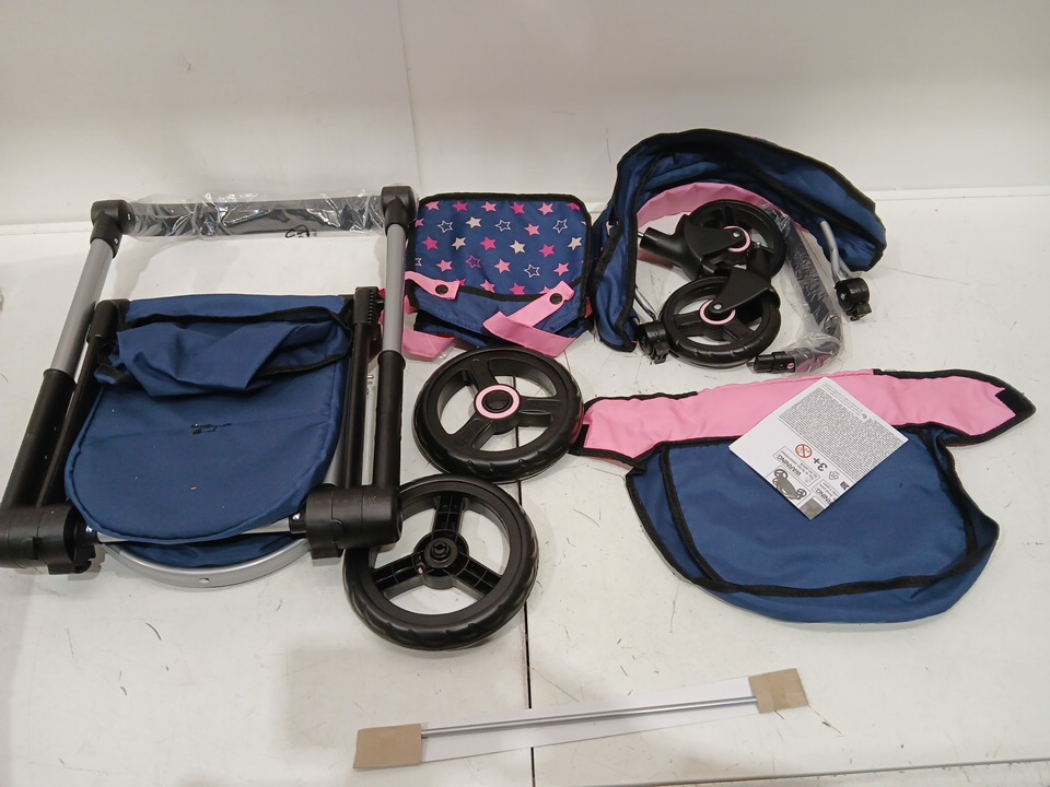 Kids Bayer xeo dolls pram/stroller with bag. Adjustable/reversible handle - Dolls up to 18" - Dark blue pink star - (model: 17016AA)