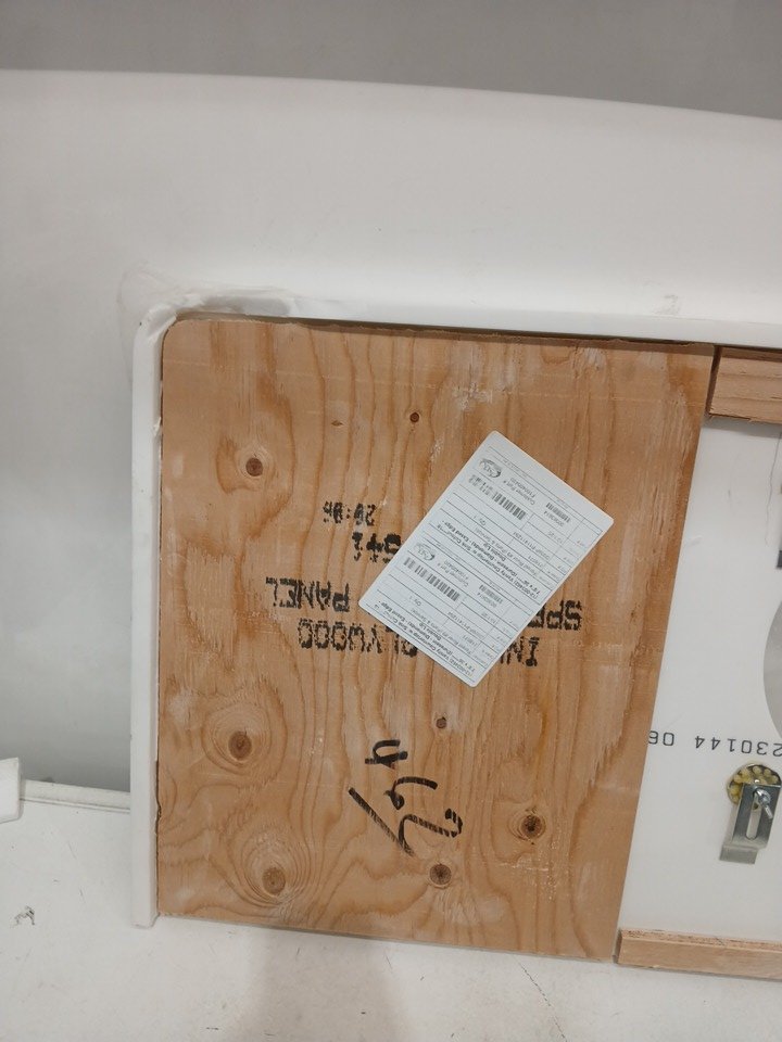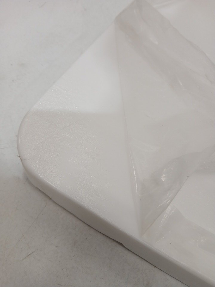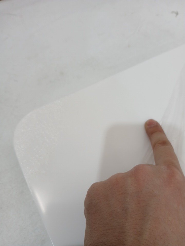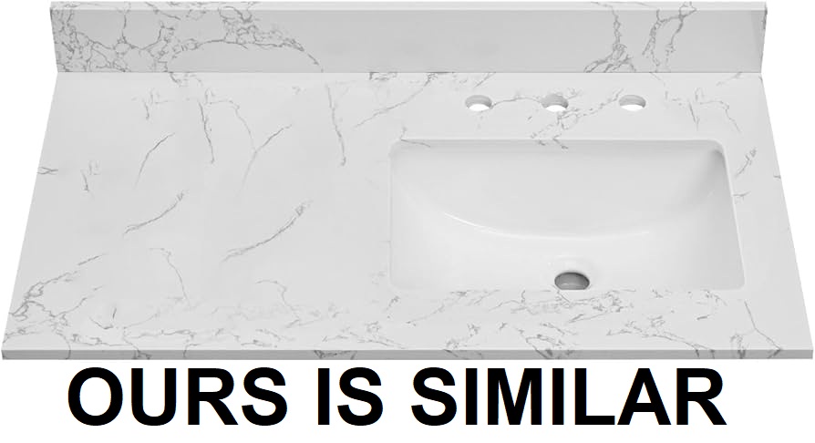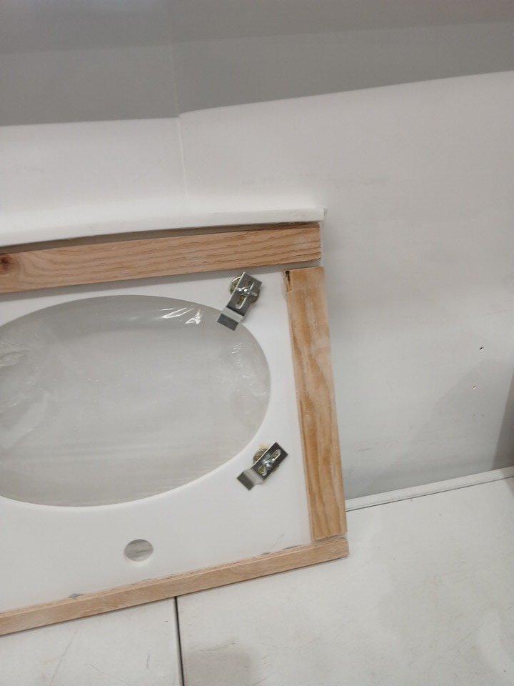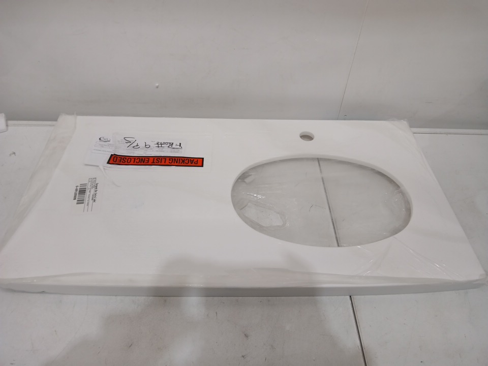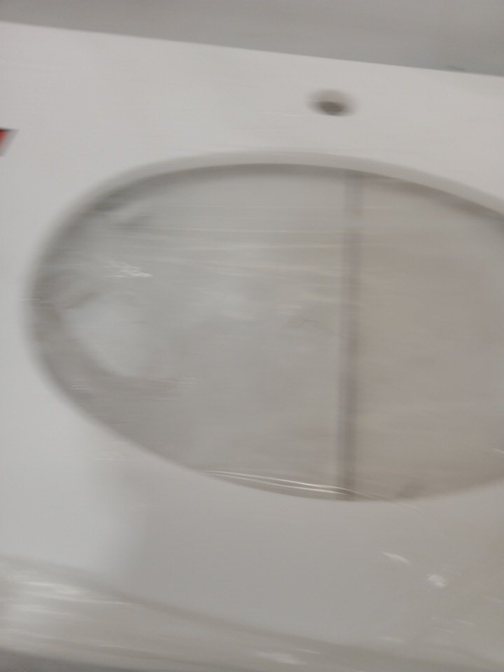 Please note some of the surface has been scuffed, and there is a small hairline crack going from the bottom right corner to where the finger is pointed in the picture. There is also some minor damage to the bottom of the sink edge.