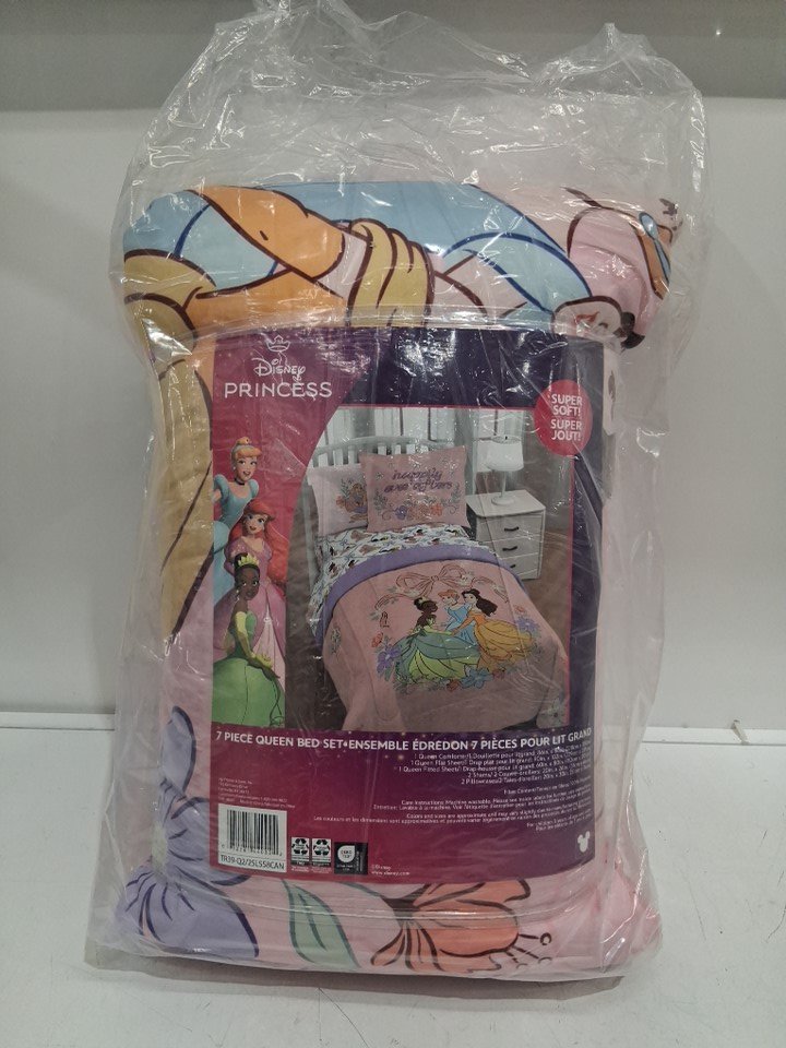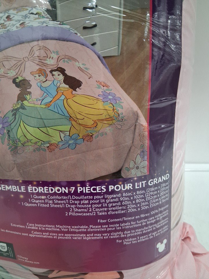 7pc disney princess comforter set- comforter, flat sheet, fitted sheet, 2 pillow cases, 2 shams- queen size- pink/purple