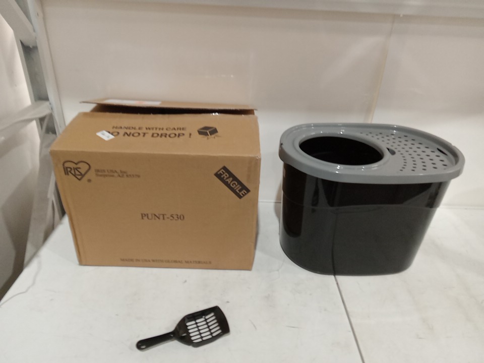 IRIS USA Oval Cat Litter Box with Catching Lid and Scoop - medium - 17" x 14" - black and grey (model:PUNT-530)