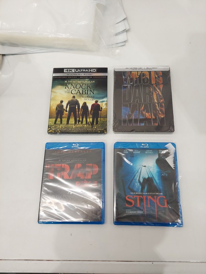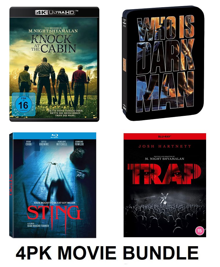 4pk BLU-RAY & 4K UHD SPOOKY/SCARY/THRILLER MOVIE BUNDLE: KNOCK AT THE CABIN, WHO IS DARK MAN, TRAP, & STING
