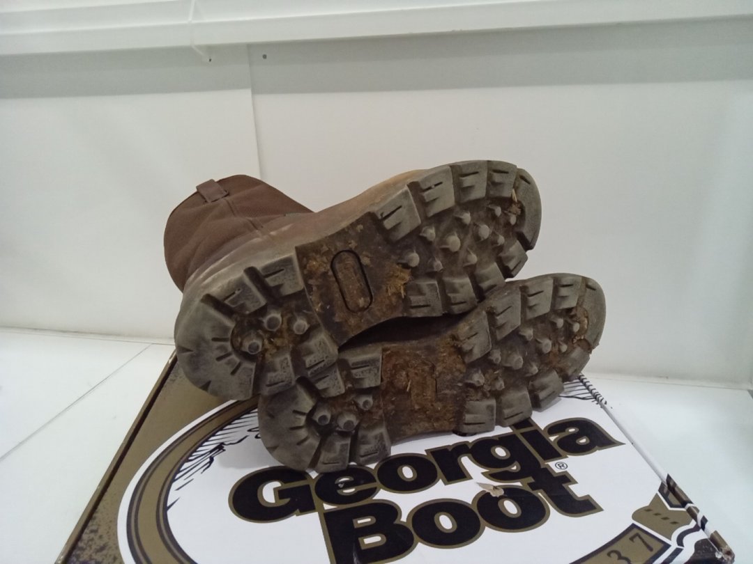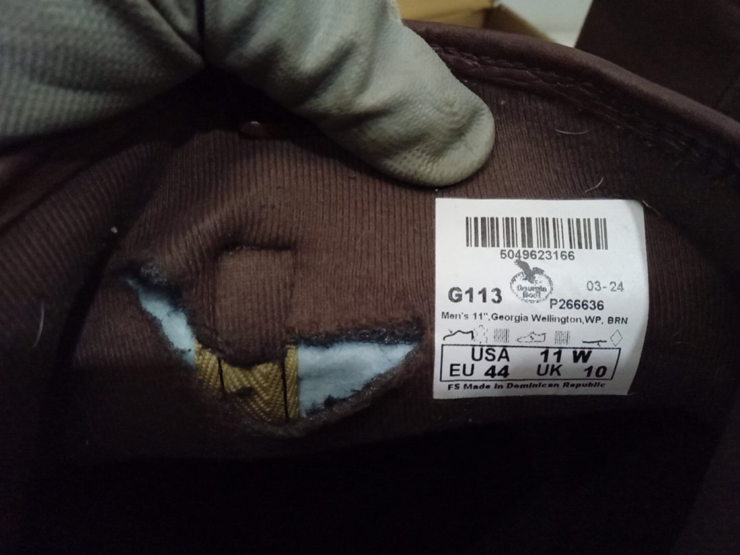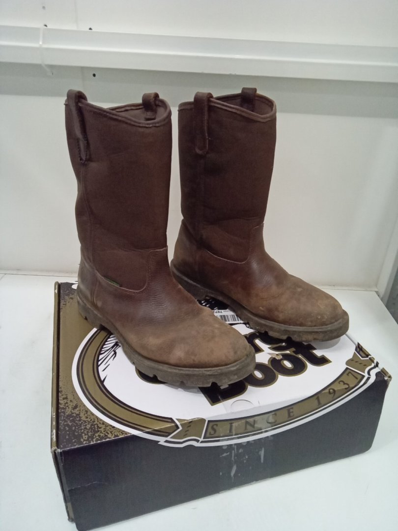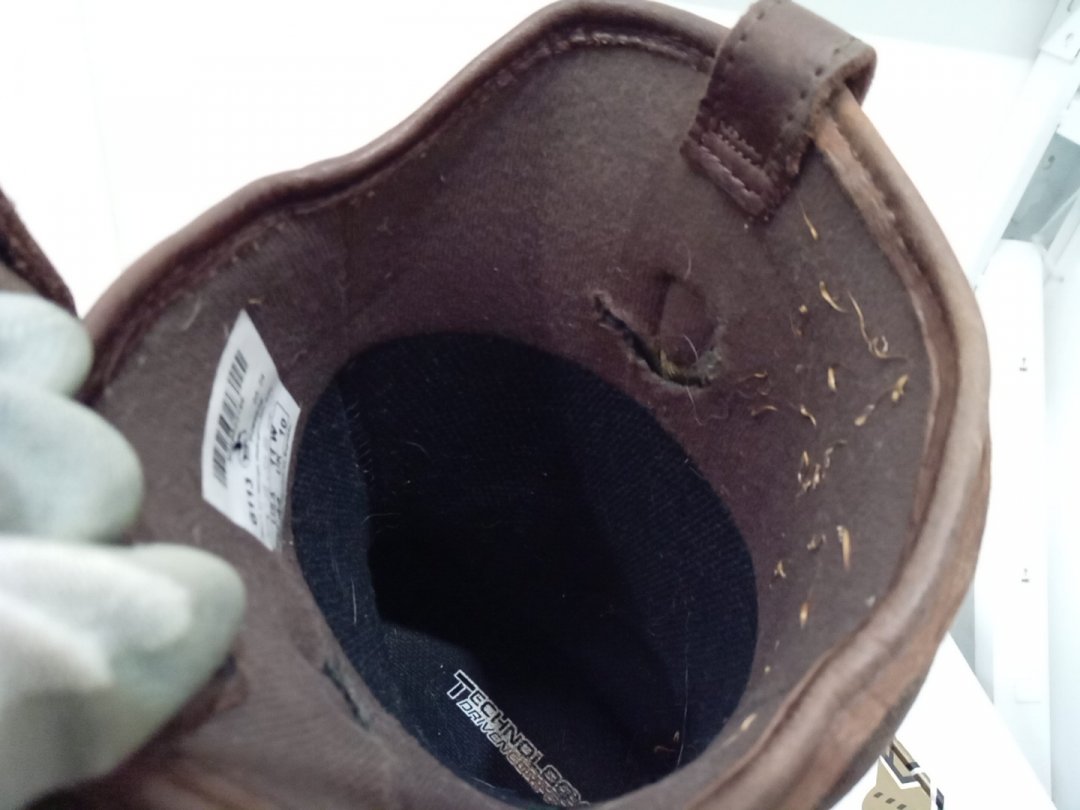 Item appears to have been worn and worked in with dried mud and scuffs on the fronts/toes. There are 2 tears inside one of the boots. Please see photos.