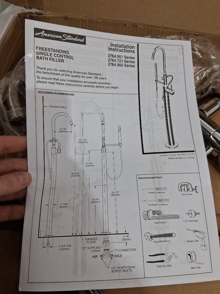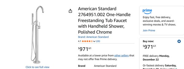 American Standard ne-Handle Freestanding Tub Faucet with Handheld Shower - 1.8GPM/6.8LPM - Polished Chrome - (Model: 2764951.002)