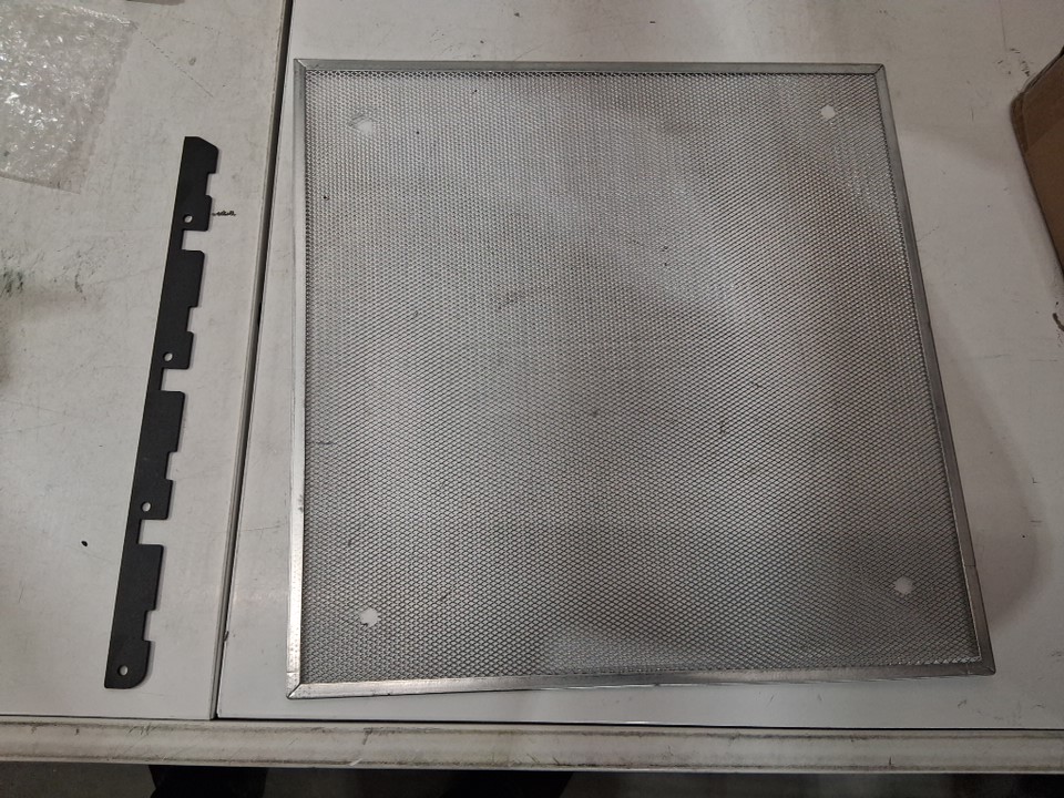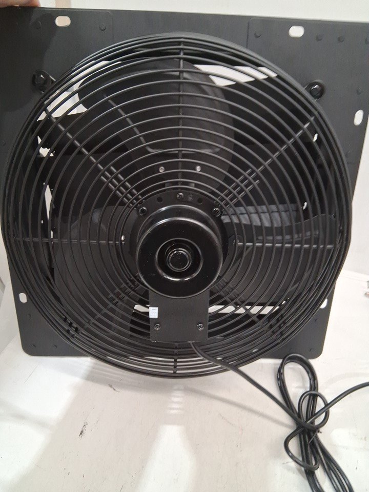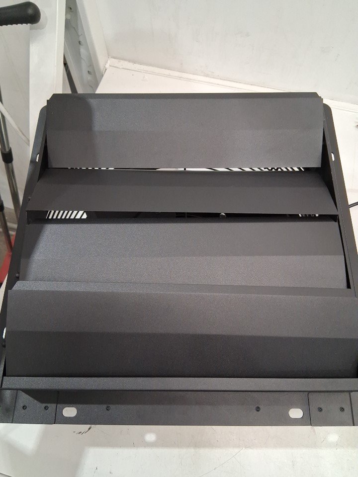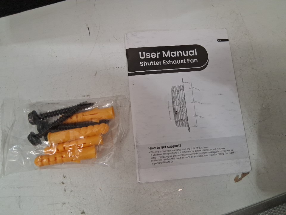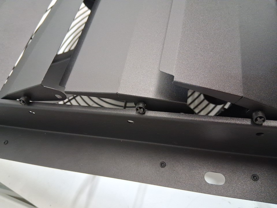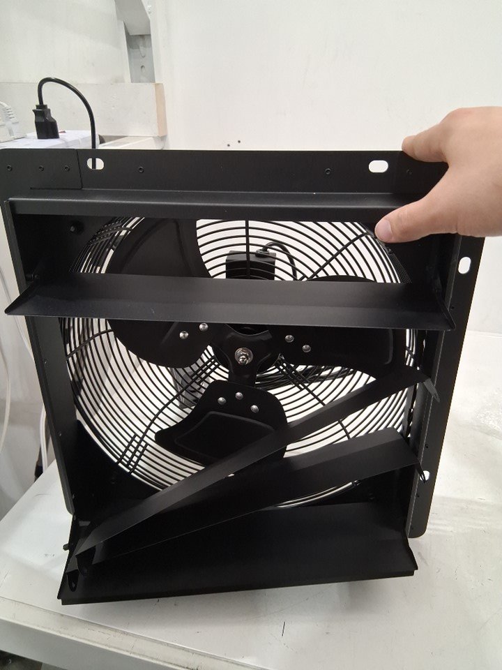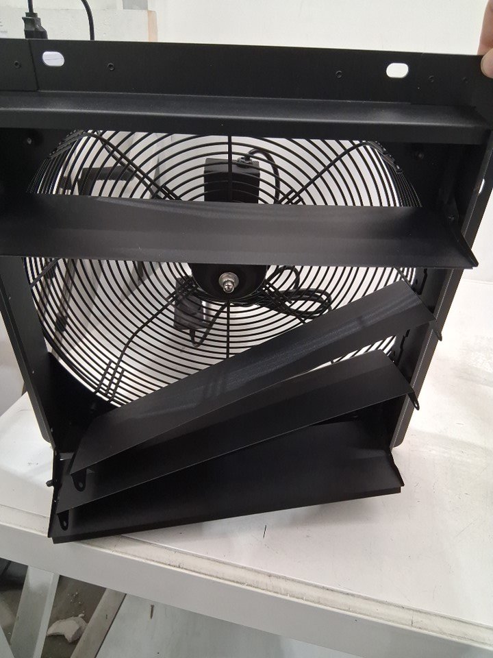 Three of the four metal panels have their plastic connectors snapped off on one side, leaving them hanging loosely in place - see photos. Customer is urged to reattach, replace, or just remove them entirely in order to avoid collision with the fan blades. Outside of this damage, there are no other visible issues or signs of use and fan function appears normal.