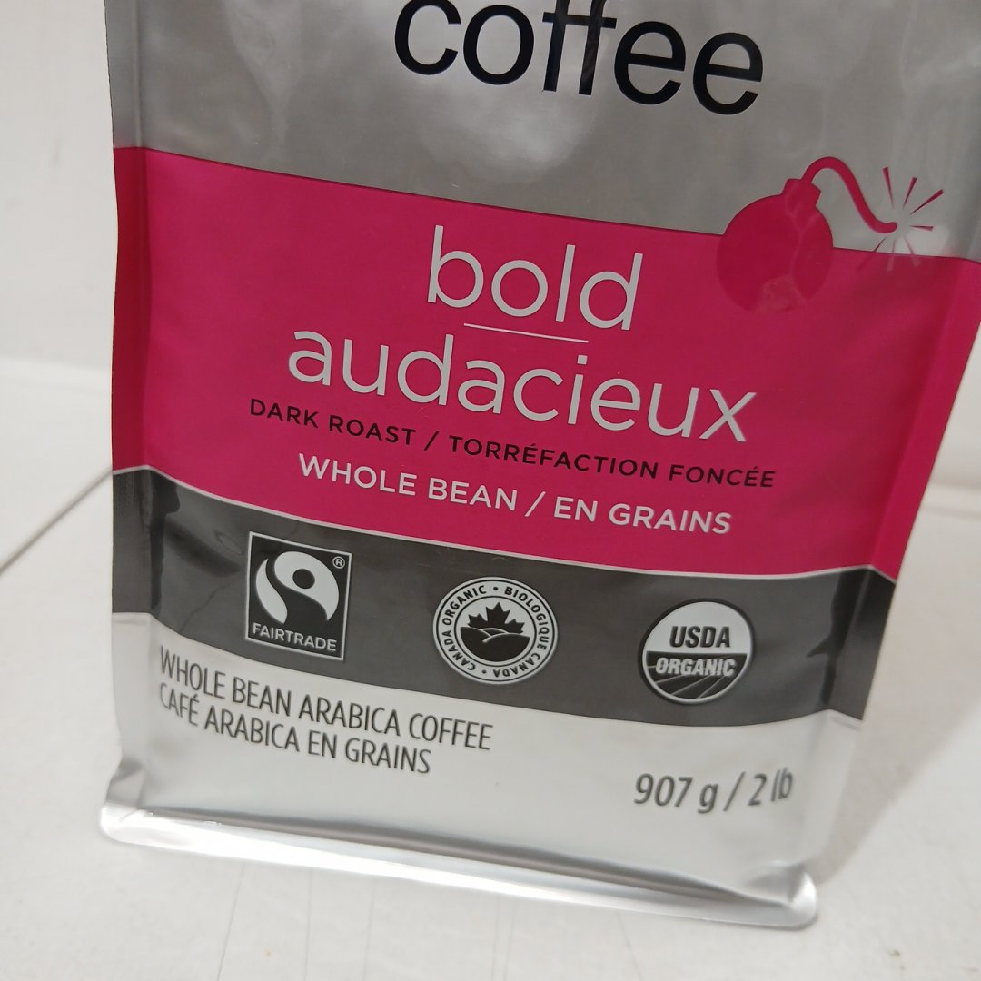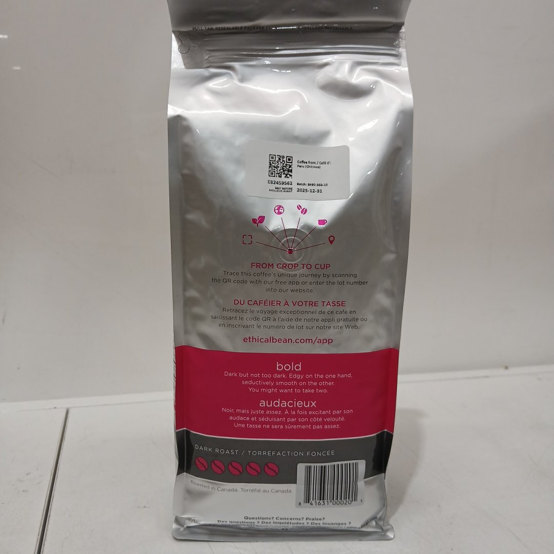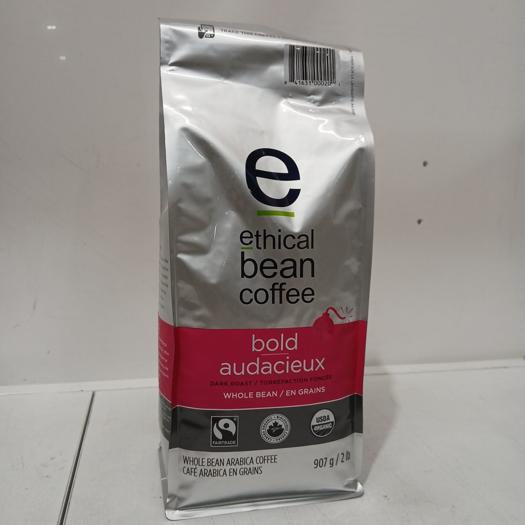 *RECENTLY EXPIRED* ETHICAL BEAN FAIR TRADE WHOLE BEAN ARABICA COFFEE, "BOLD" - DARK ROAST - 907G / BAG