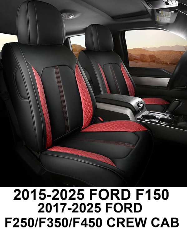 Full Set FREESOO Waterproof PU Faux Leather Seat Covers - For 2015-2025 Ford F150, 2017-2025 Ford F250, F350, F450 Crew Cab - Black/Red
