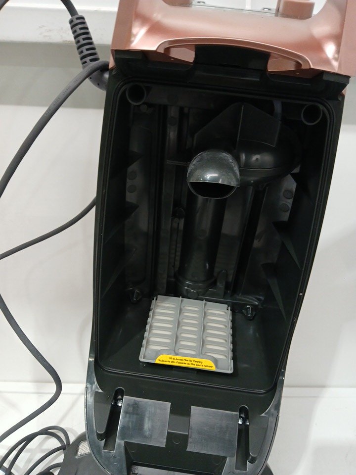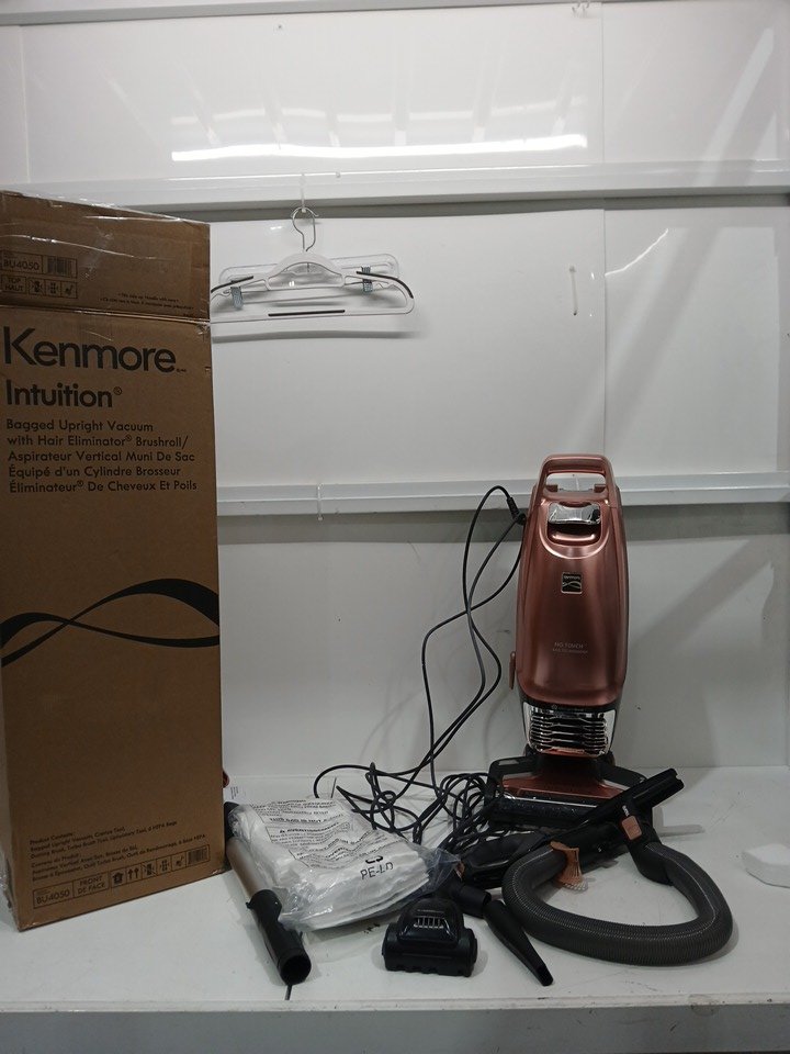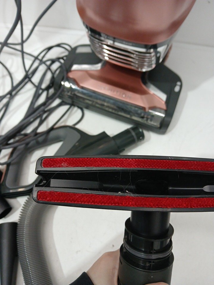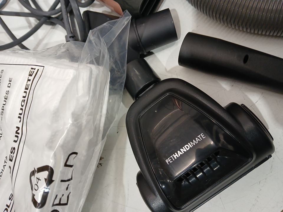 Has some hair and debris on the attachments and base of the vacuum. Tested for power. Some of the attachments are scuffed.