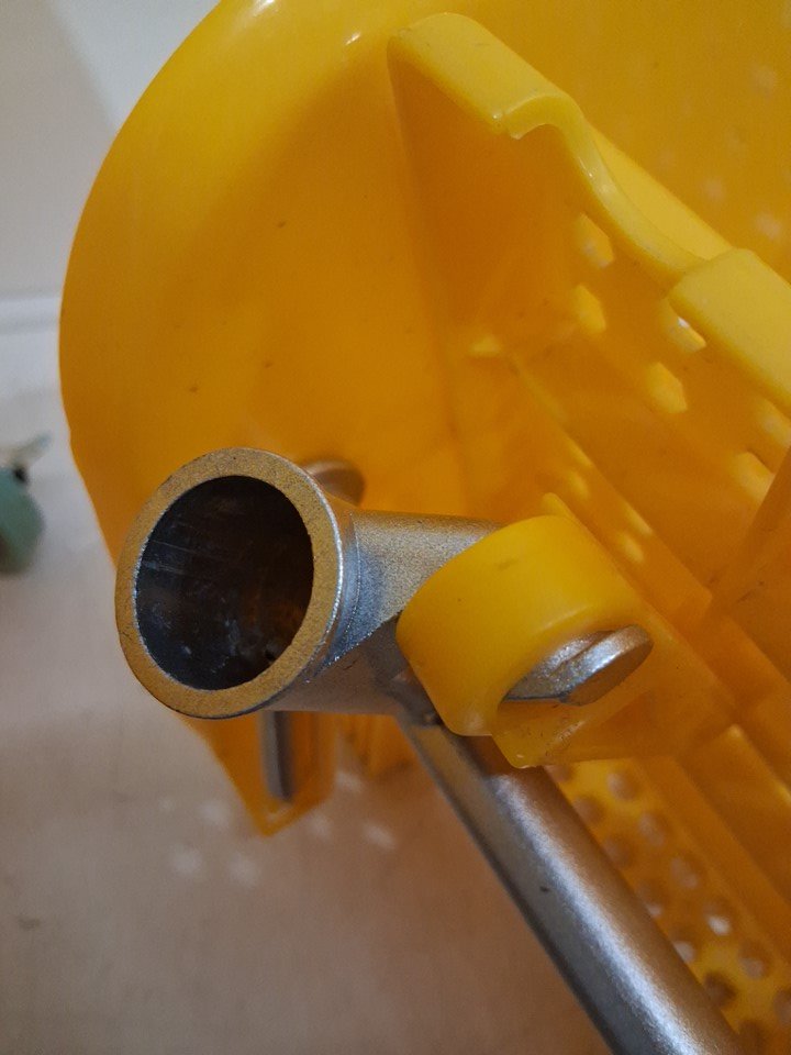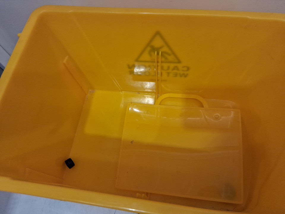 there is some light dirt on the bucket as well as the mop head is used. one of the black runner pieces is missing. refer to picture.