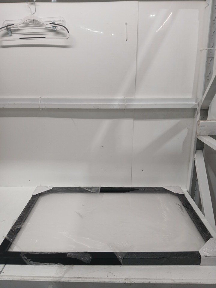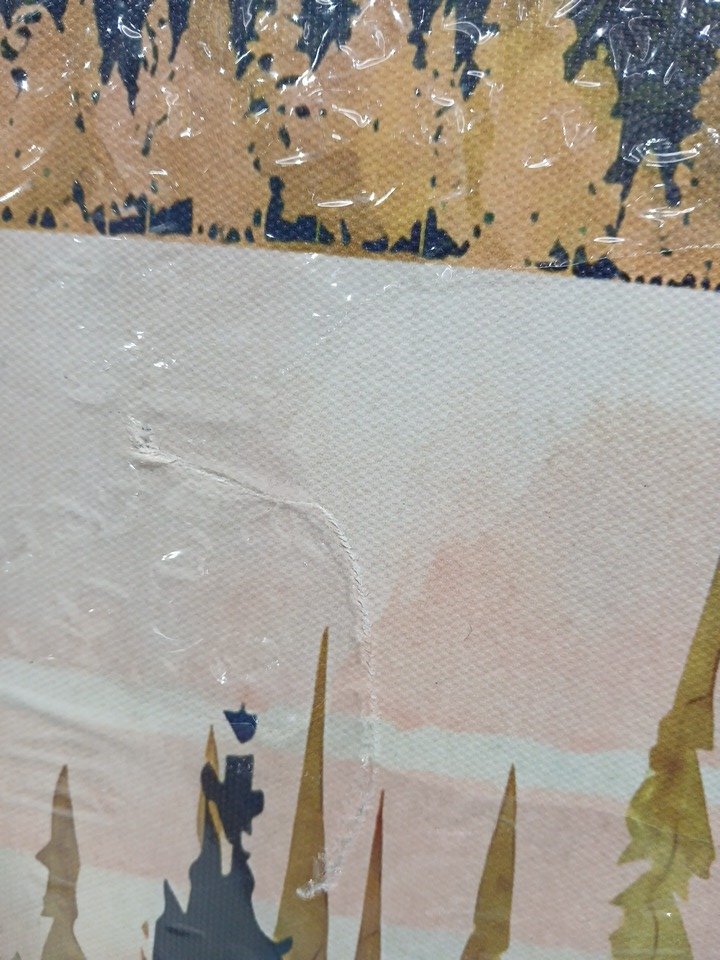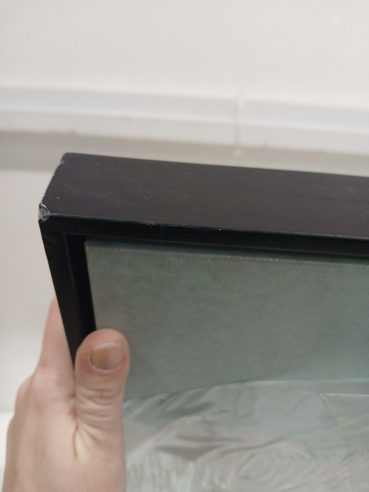 Has a few scratches/blemishes on the surface. One corner of the frame is chipped.
