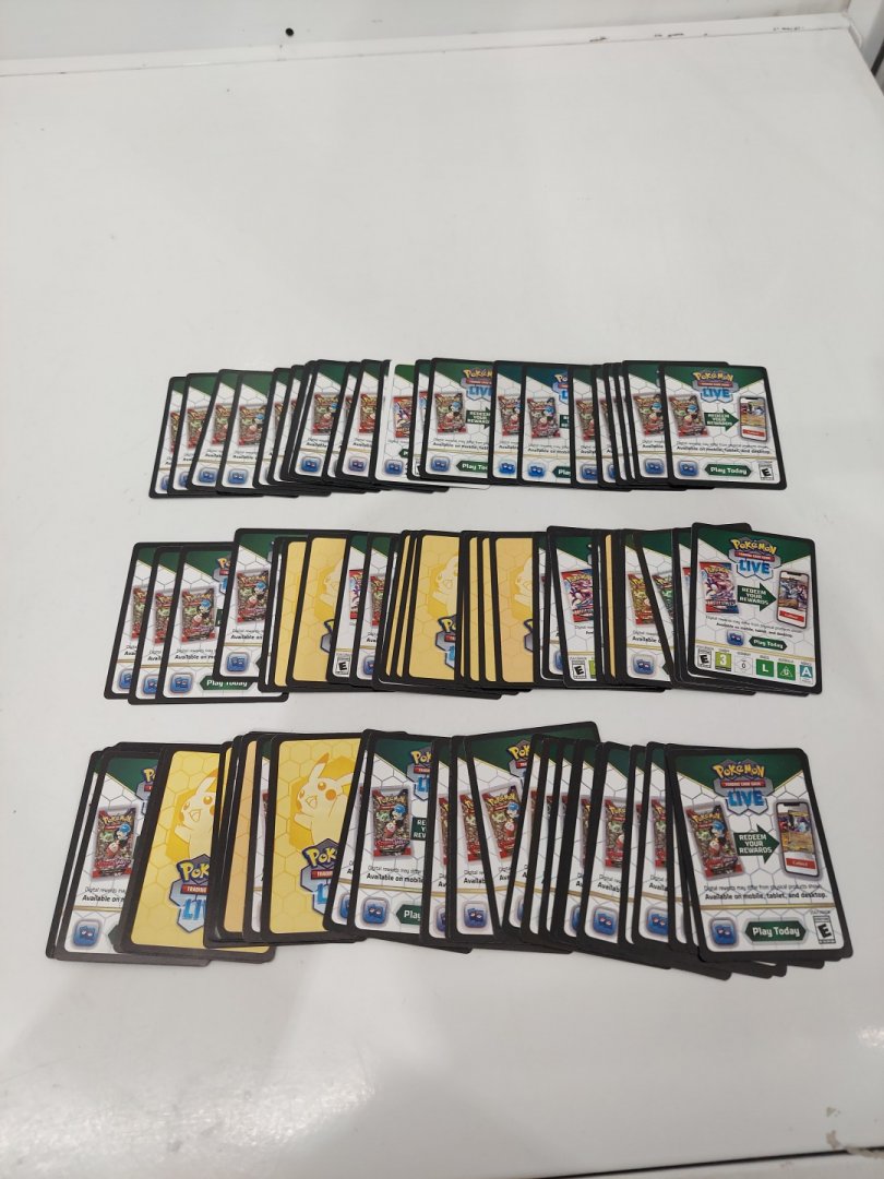 Please note that these are code cards from opened packs only and staff was not able to confirm how many of them, if any, have been redeemed. Please be aware of this prior to placing bids as redeemed codes cannot be redeemed again. These code cards are for the digital card game pokemon tcg live available on ios, android, & pc.