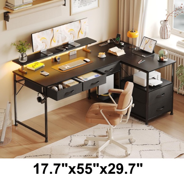 Mexin L Shaped Computer Desk with 5 Fabric Drawers- 17.7"x 55"x 29.7" - black (model: h0101992-black)