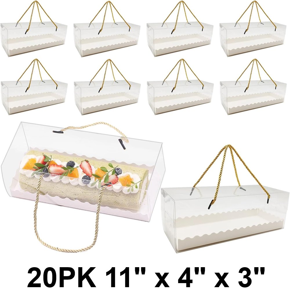 20pk rectangular Cake Box with Handles and insert - 11" x 4" x 3" - gold white clear