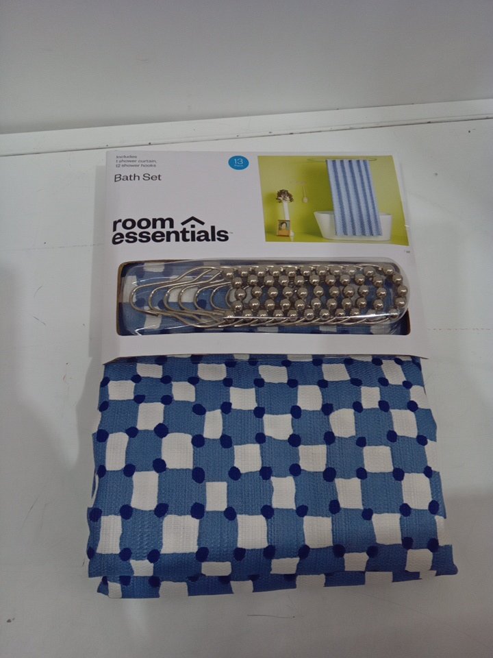 room essentials FABRIC SHOWER CURTAIN bath SET with hooks included - 72" x 72" - blue/white
