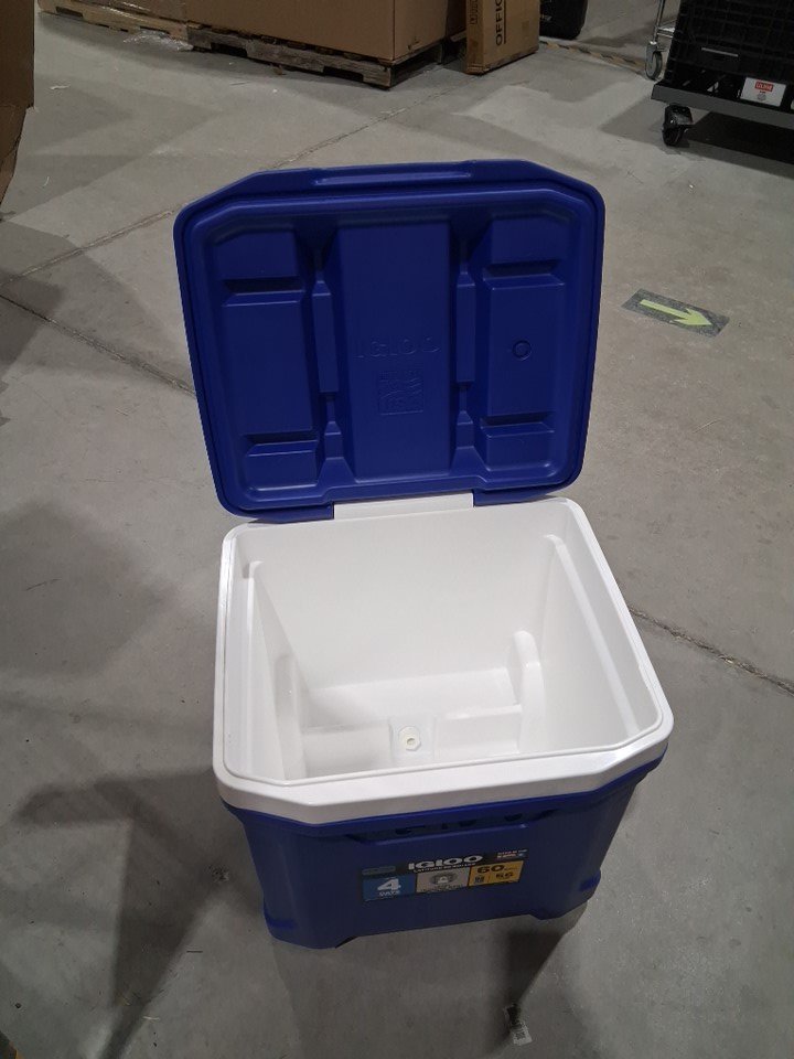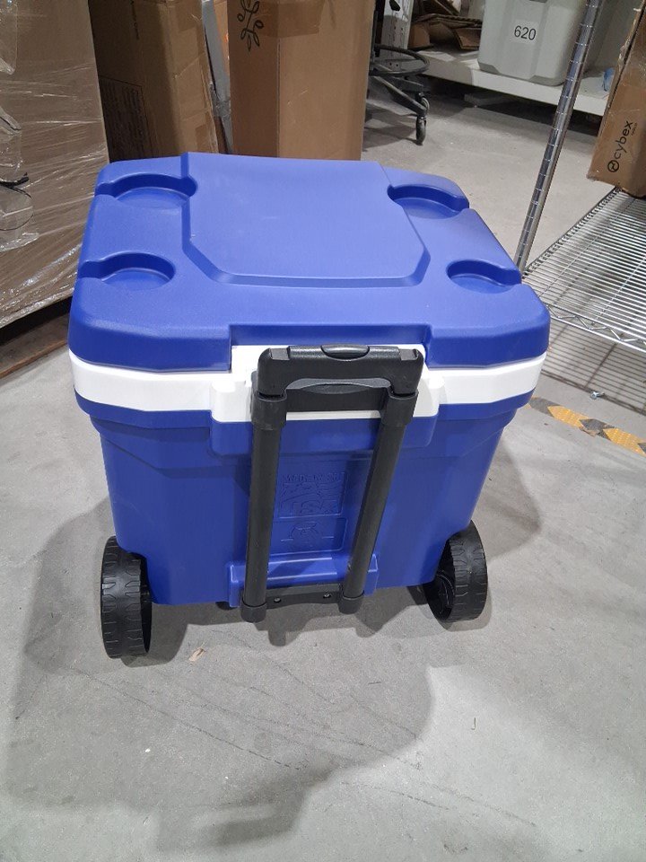 IGLOO 60QT ICE CUBE WHEELED ROLLER COOLER, FIT 90 STANDARD CANS - OCEAN BLUE/WHITE