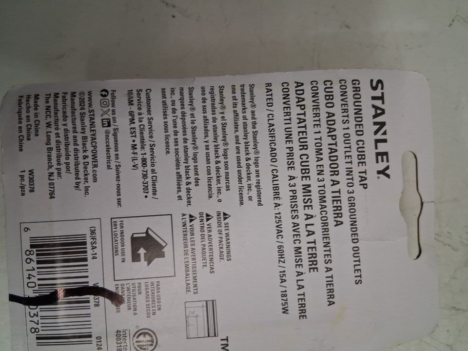 3 Stanley Grounded Cube Tap - 3 Grounded Outlets - White (Model: W30378)