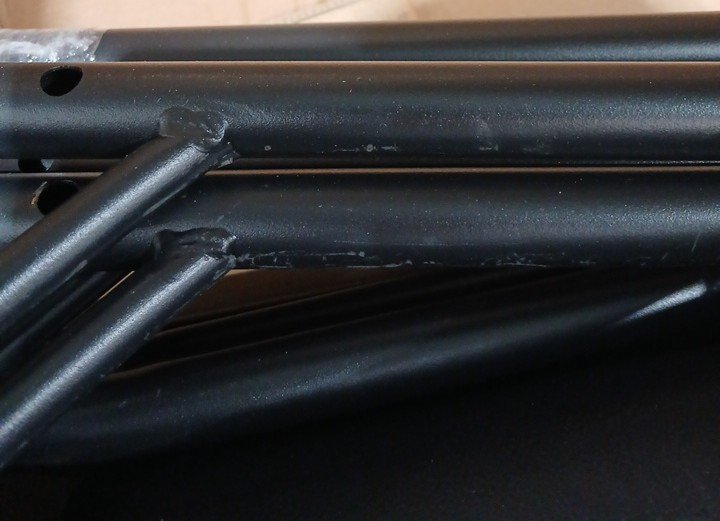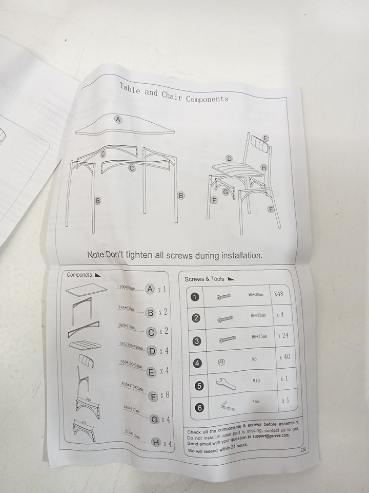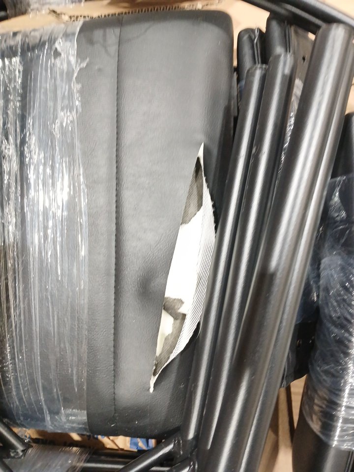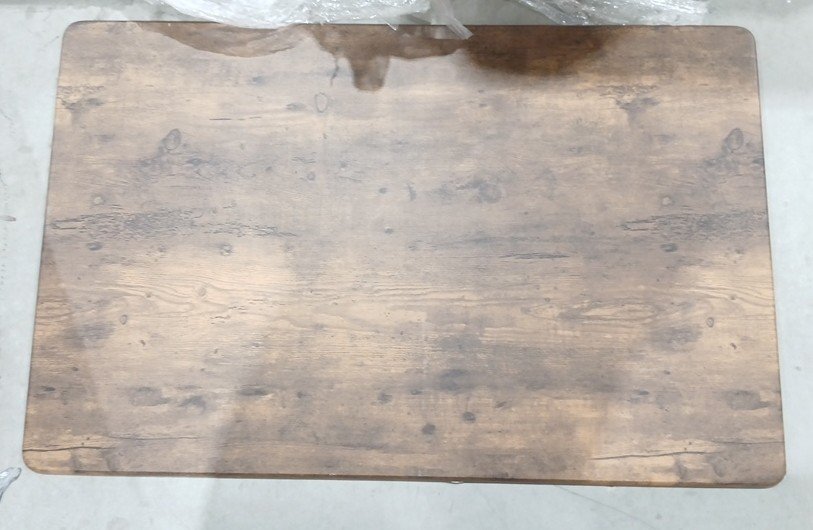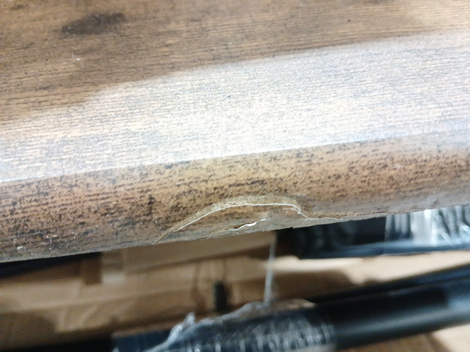 One of the cushions for one of the chairs has a large tear. This item has some scratches. The side of the table top has a chip in it