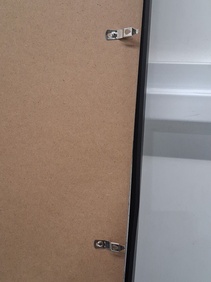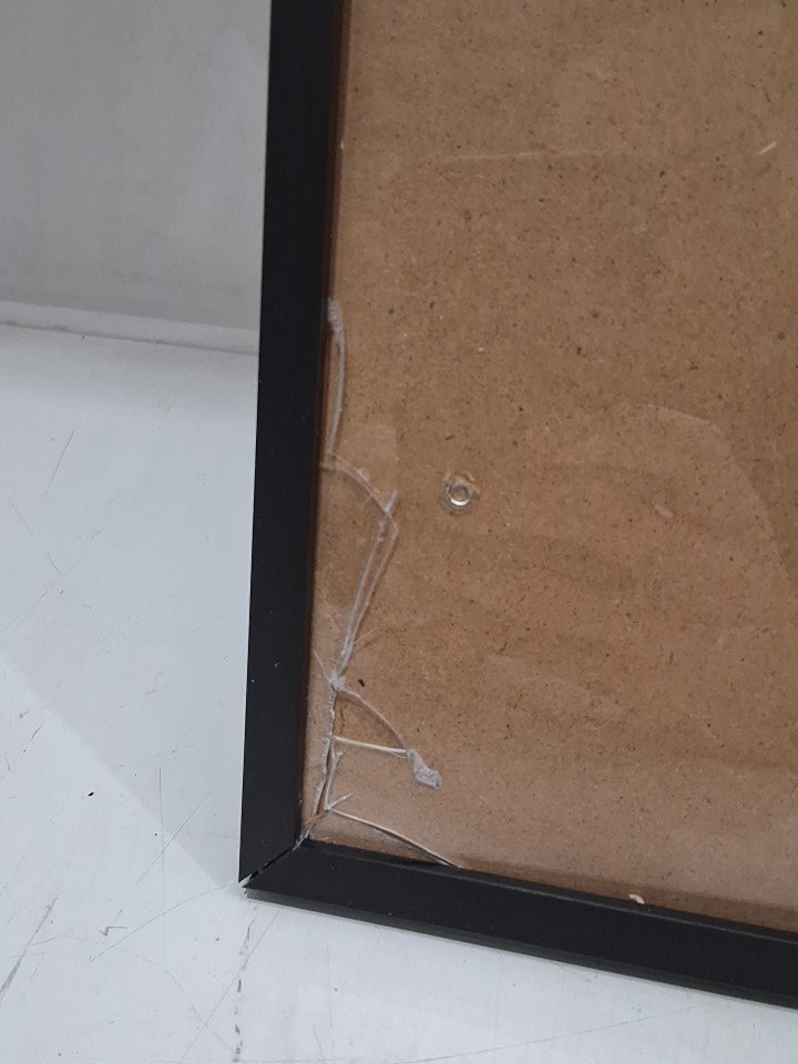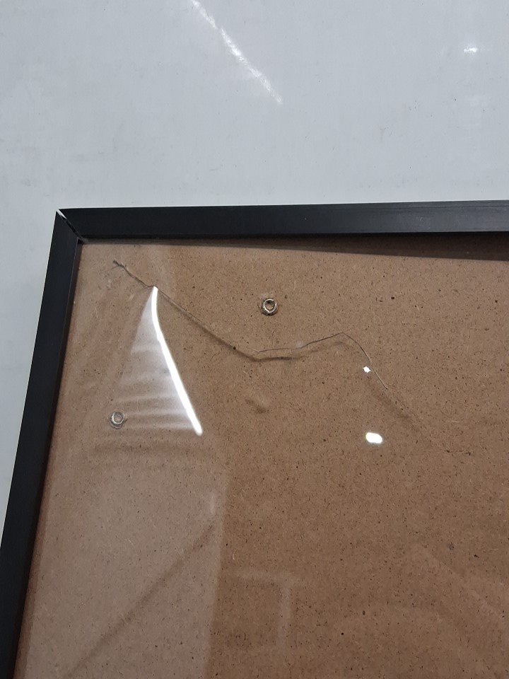Item has some cracking in the acrylic near 2 of the corners, the left side of the frame is slightly warped causing some of the clips on the back to be unable to lock to the frame, see photos.