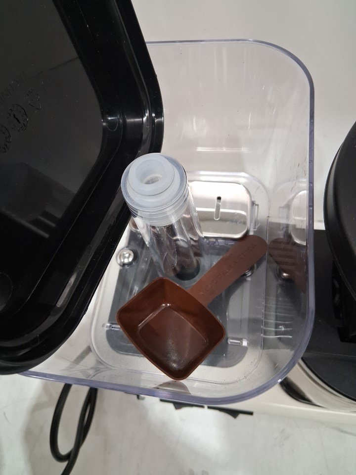 there is coffee grind in the holding container and the glass pot is coffee stained. tested for power only.