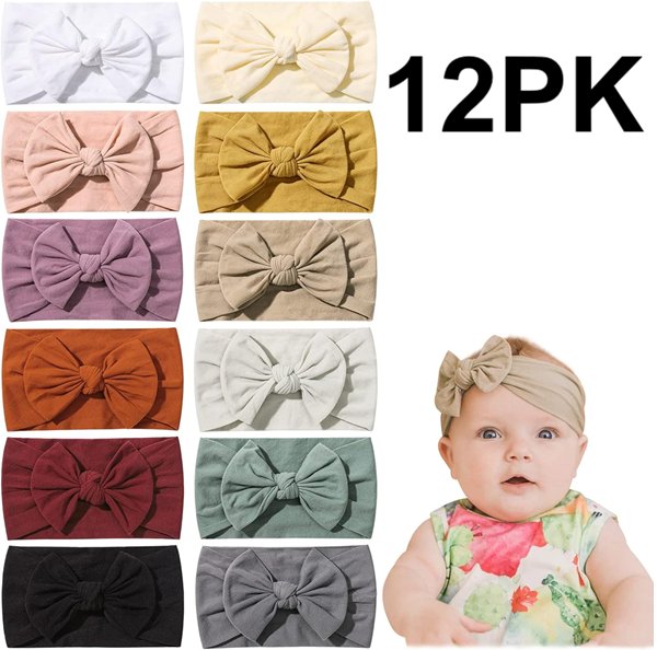 12PK BABY GIRL JOLLYBOWS ELASTIC HEADBANDS WITH BOWS - MULTI COLOUR