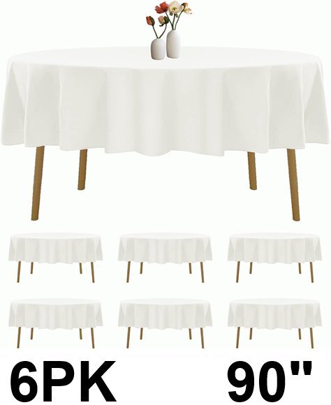 6PK Wrinkle Resistant Washable Round Tablecloth - 90" - WHITE