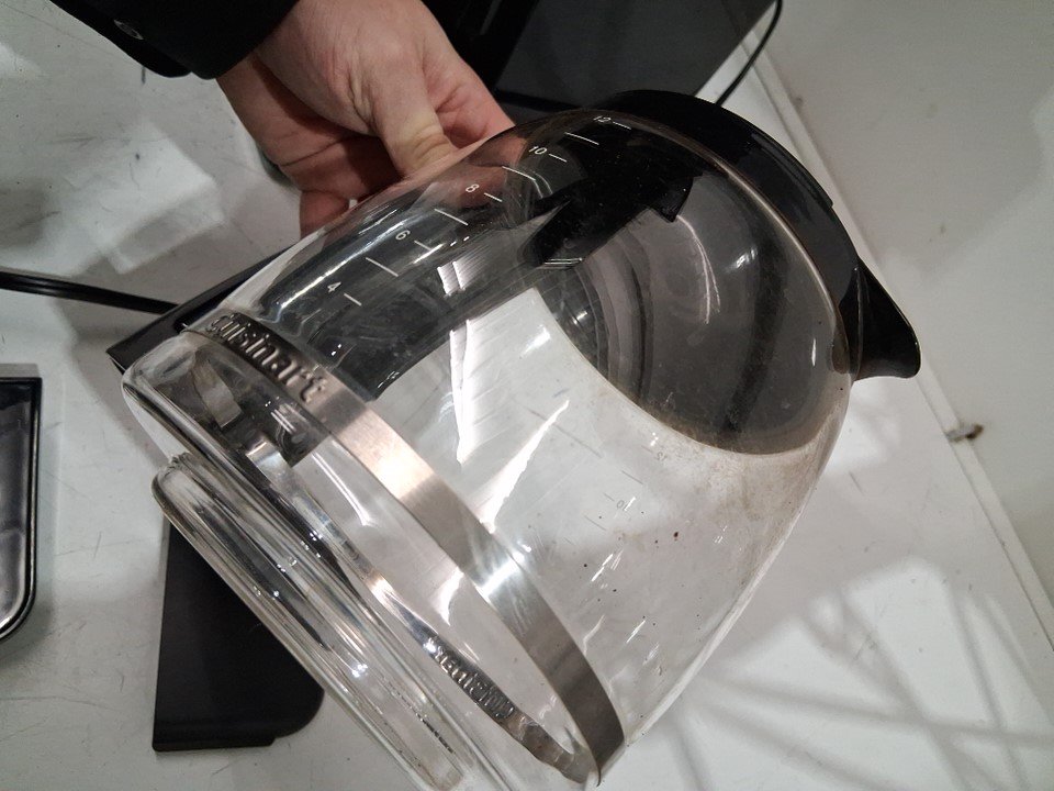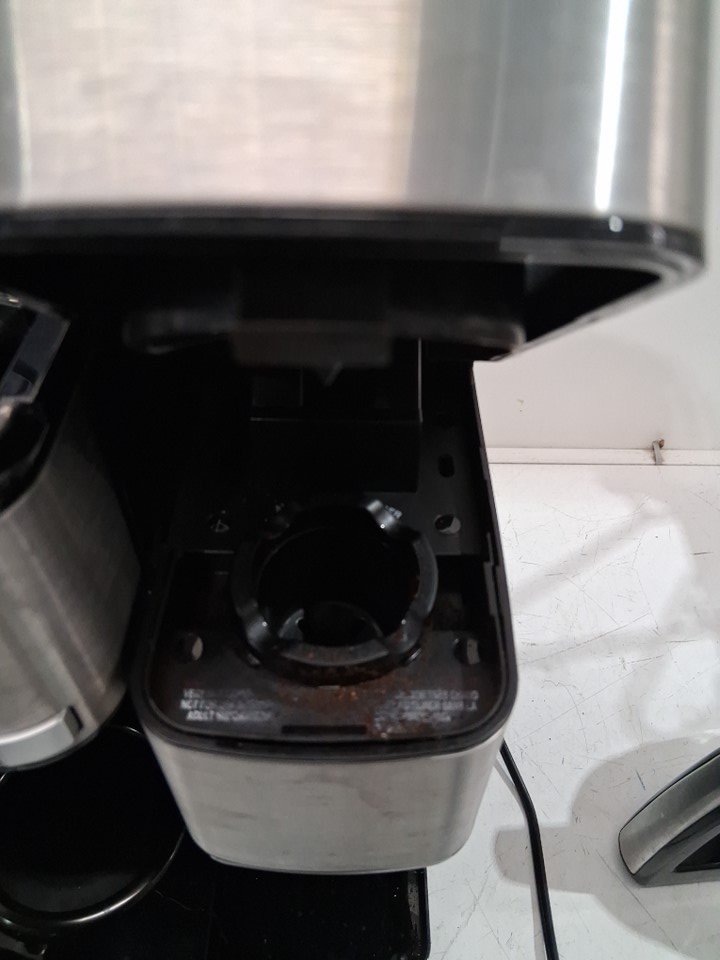 Some coffee grounds were found inside the product. The coffee pot is stained and discolored Product was tested for power