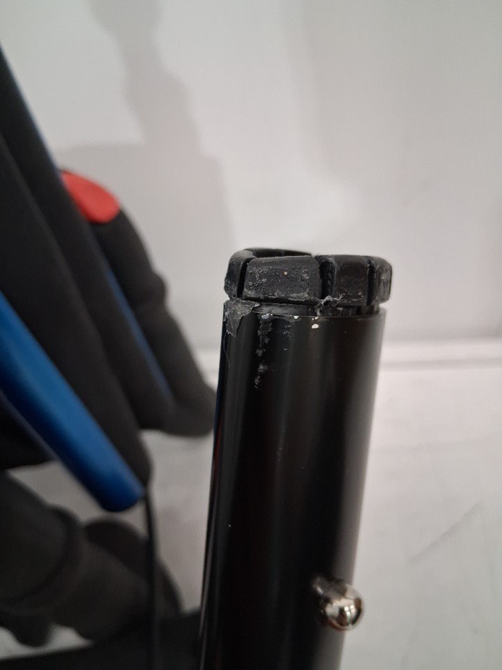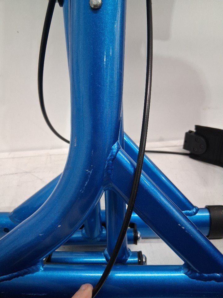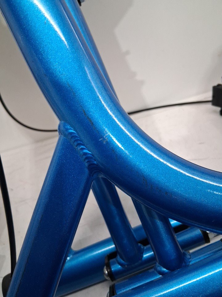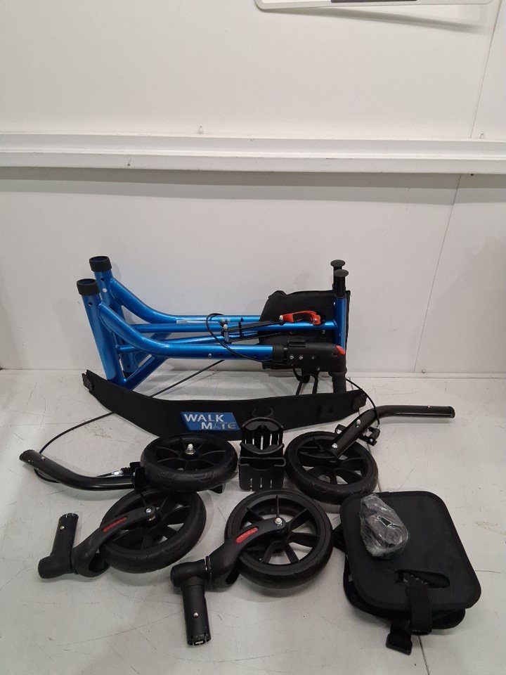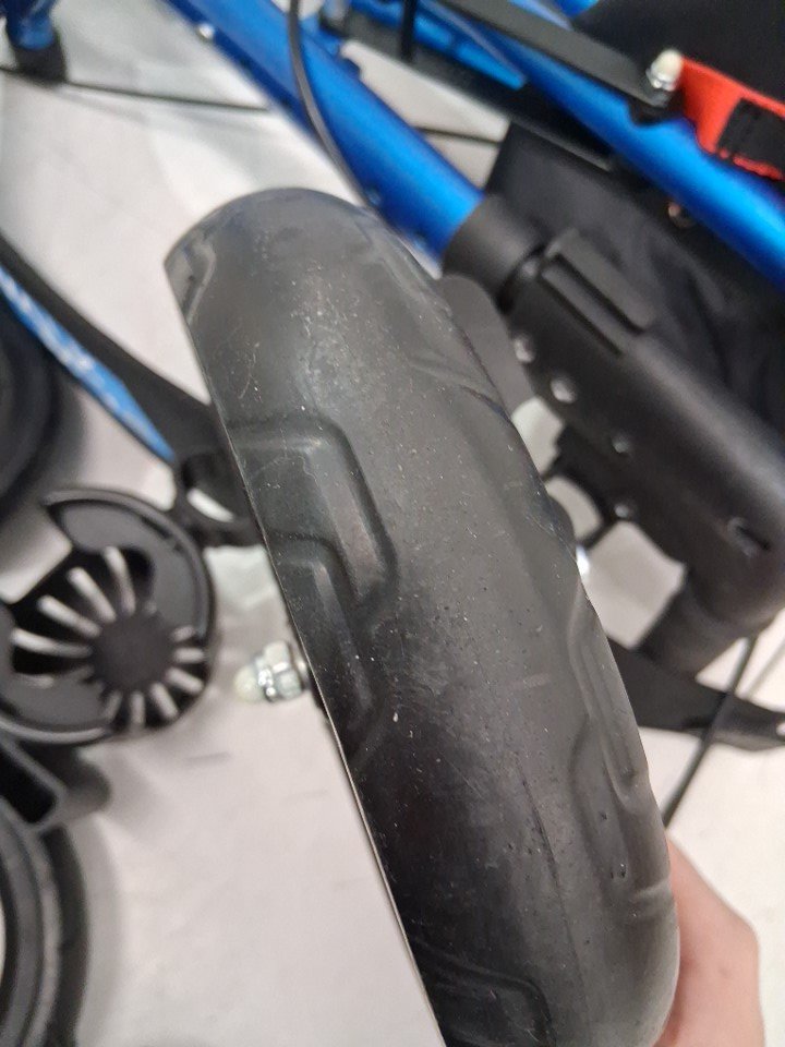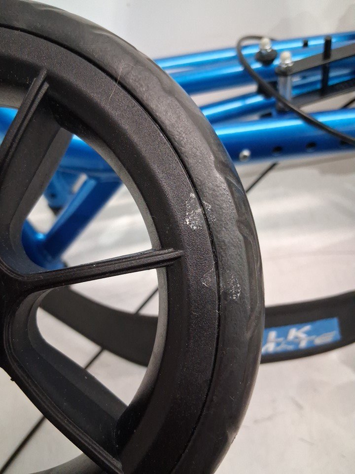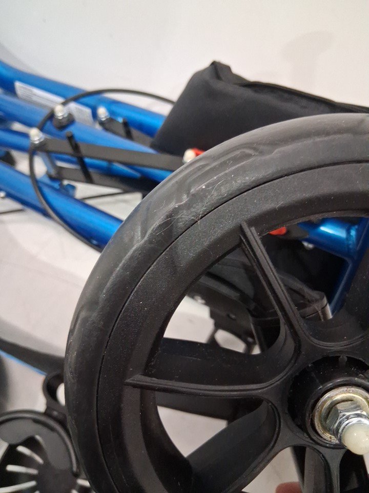 There are scuff marks on all of the poles that connect the wheels to the roller from previous set up, there is also black streak marks on each side of the walker (See photos), and the wheels show signs of light use.