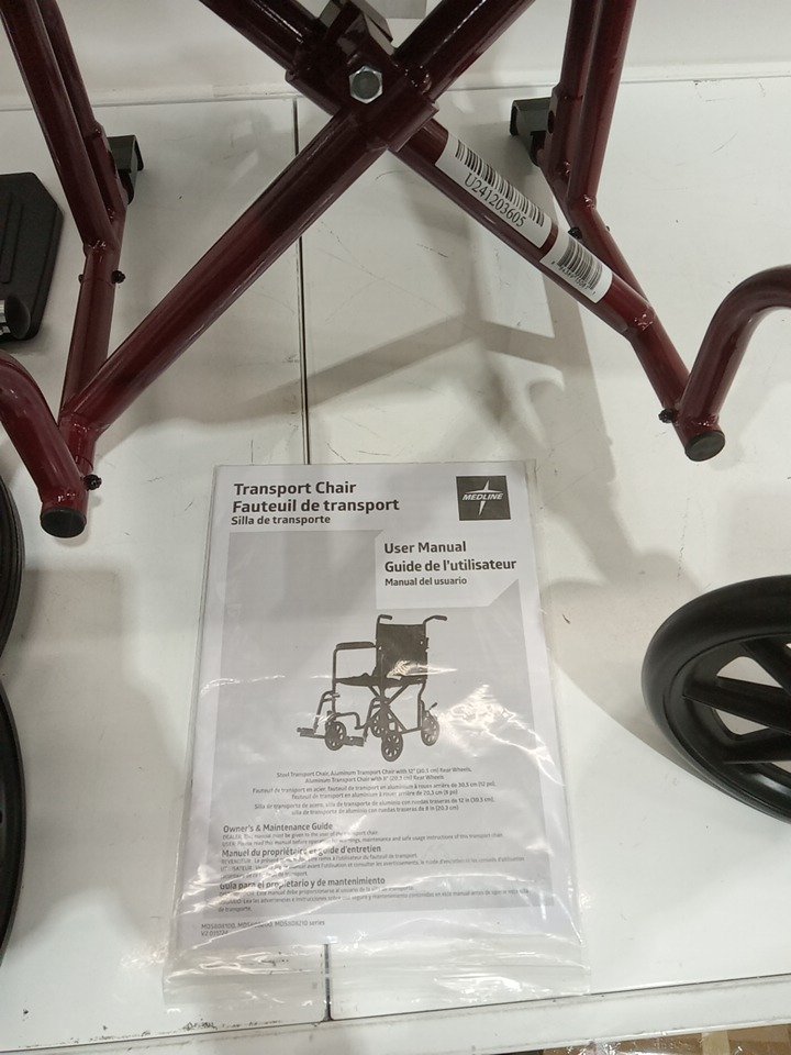 MEDLINE BASIC ALUMINUM TRANSPORT WHEELCHAIR - 19" - 12" REAR WHEELS WITH BRAKES - 300lbs capacity - RED (MODEL: MDS808210ARE)