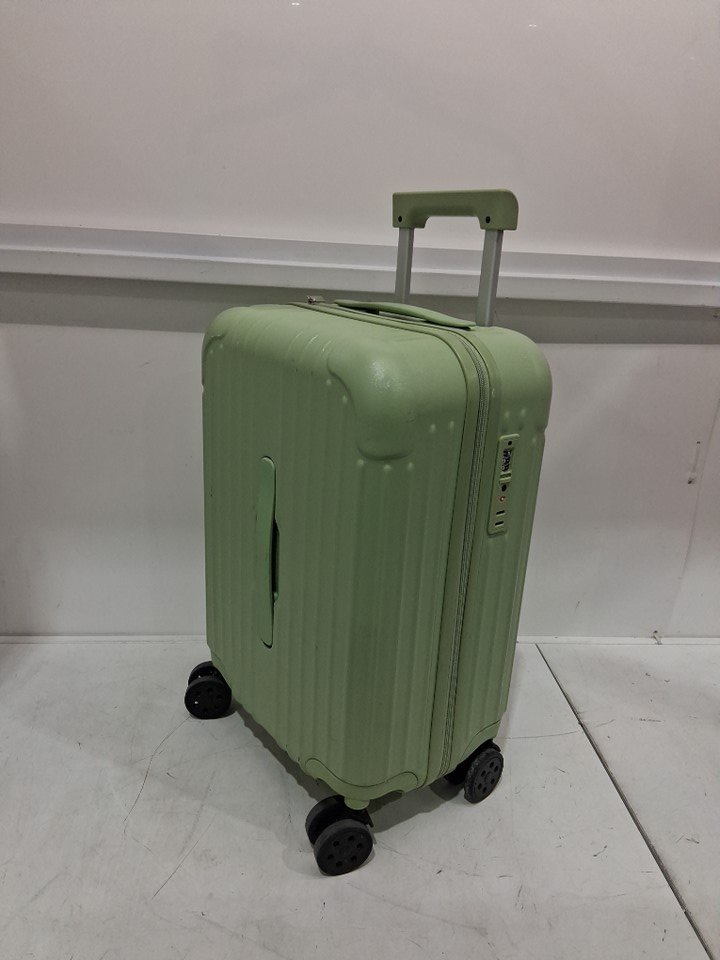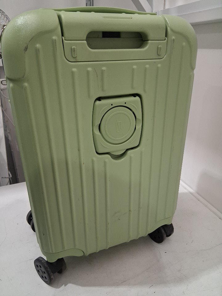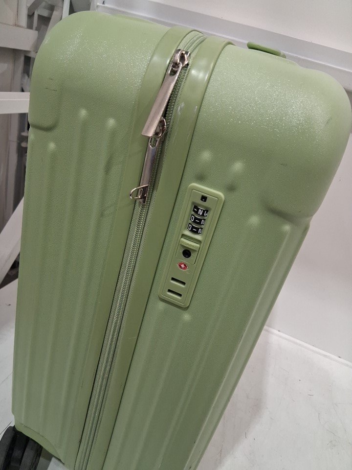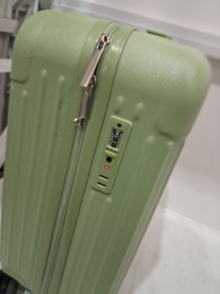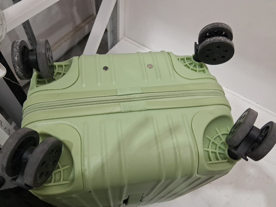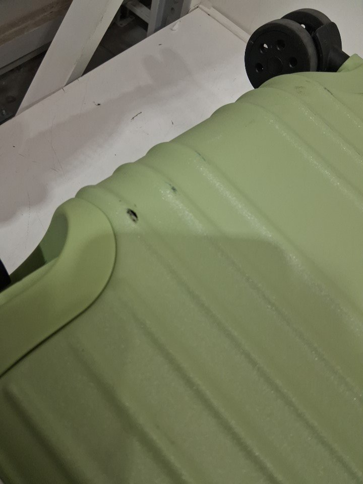 there is marks and black scuff on the entirety of the luggage. wheels are dirty with debris. no key of lock still opens.