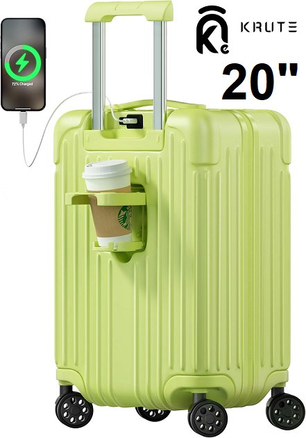 Krute lightweight ABS Hard Shell Luggage Suitcase for Travelling with USB Charging Port, TSA Lock and drink holder- 20" - apple green