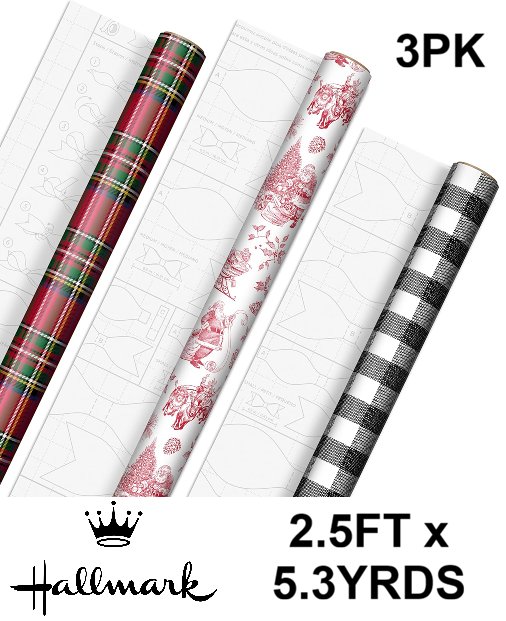 3PK HALLMARK CHRISTMAS WRAPPING PAPER ROLLS - 2.5FT X 5.3YRDS (EACH) - SANTA/PLAID