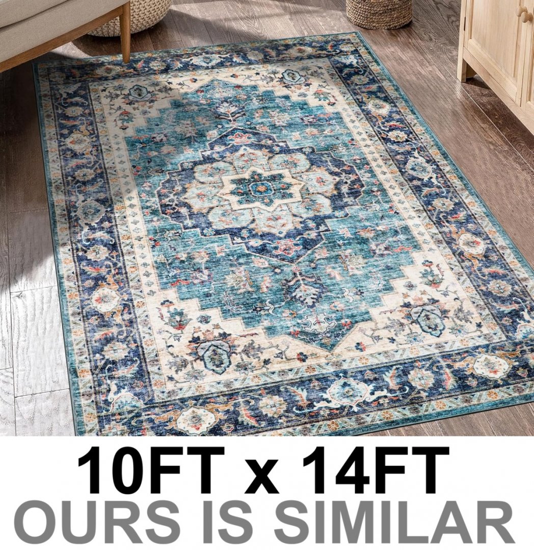 machine washable Vintage boho area rug - 10ft x 14ft - blue/white