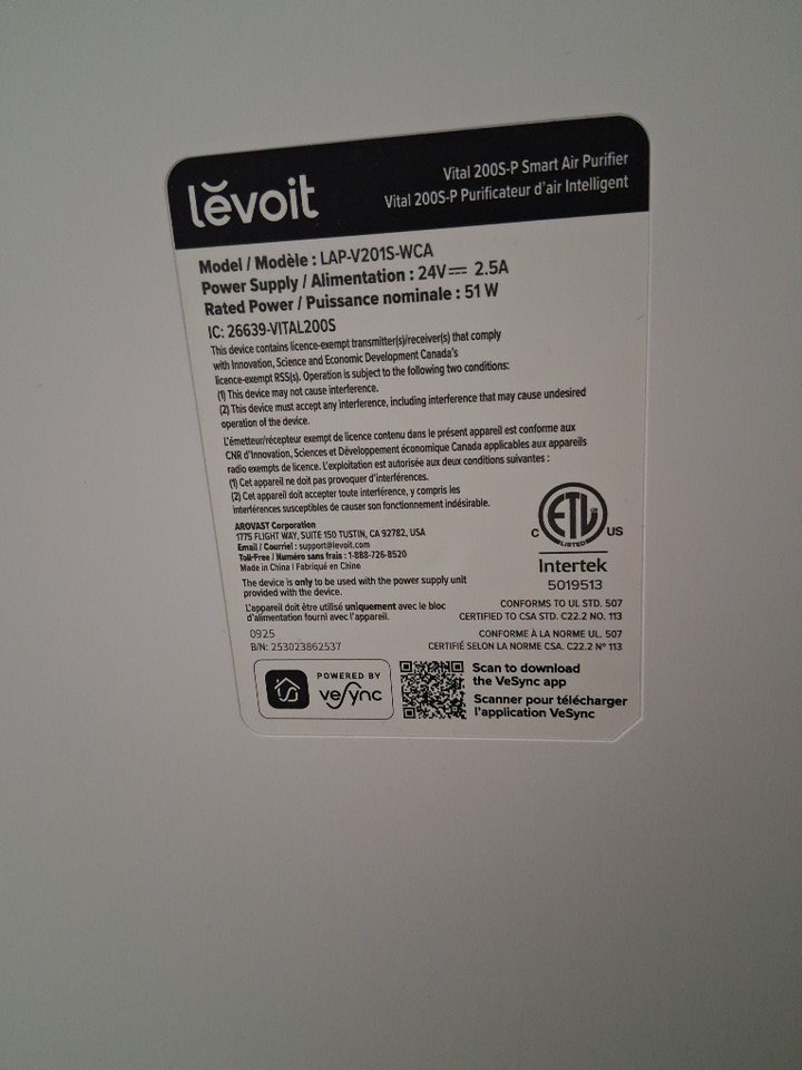 LEVOIT VITAL 200S SMART TRUE HEPA AIR PURIFIER WITH APP CONTROL & INFRARED SENSOR SCAN - 380SQ.FT COVERAGE - WHITE - (MODEL: lap-v201s-wca)