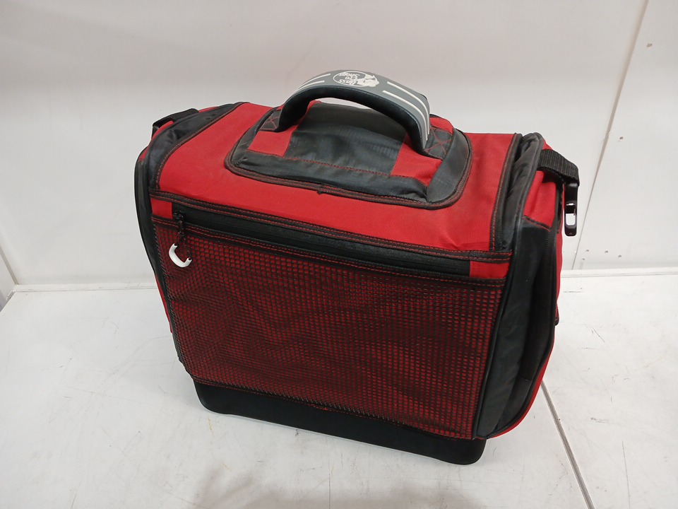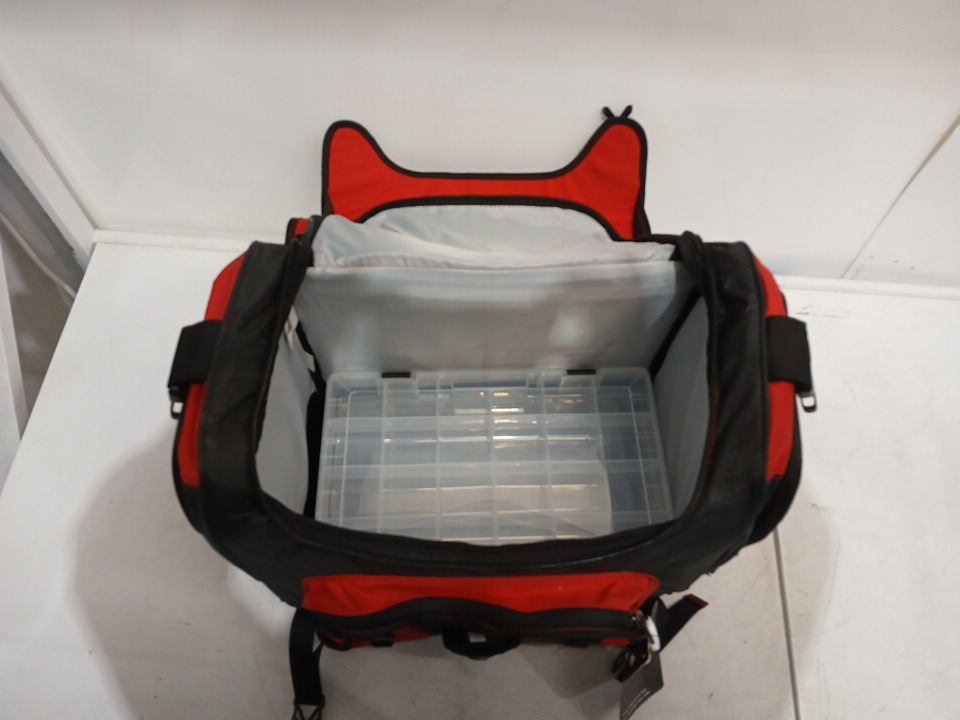 the bag is in good condition, the arm strap is missing along with a few plastic tackle cases inside. see images.