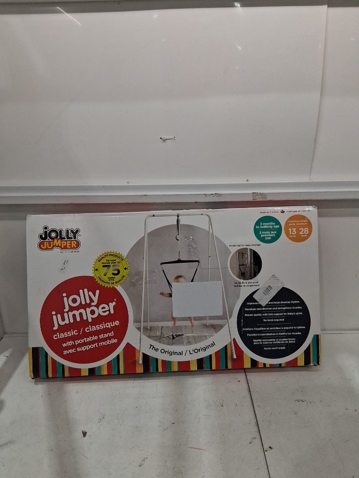 Jolly Jumper Classic Portable Baby Exerciser With Grey Fabric Saddle - 28 LBS Max - White/black (Model: 108)