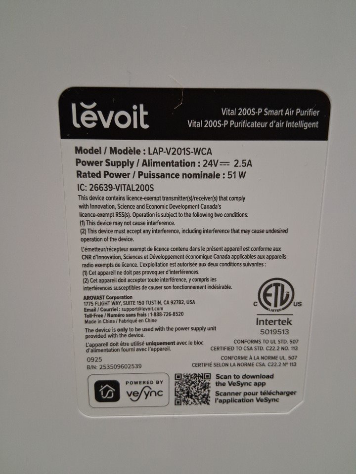 LEVOIT VITAL 200S SMART TRUE HEPA AIR PURIFIER WITH APP CONTROL & INFRARED SENSOR SCAN - 380SQ.FT COVERAGE - WHITE - (MODEL: lap-v201s-wca)
