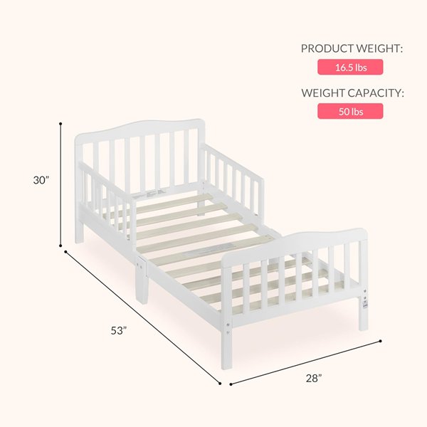 Dream On Me classic design toddler bed frame - 53" x 28" x 30" - 50lbs CAP - WHITE (model: 624)
