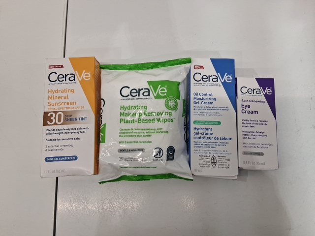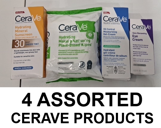 4 ASSORTED CERAVE PRODUCTS - mineral tinted sunscreen makeup removing wipes moisturizing gel cream and eye cream