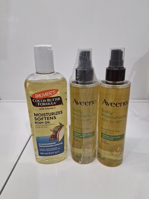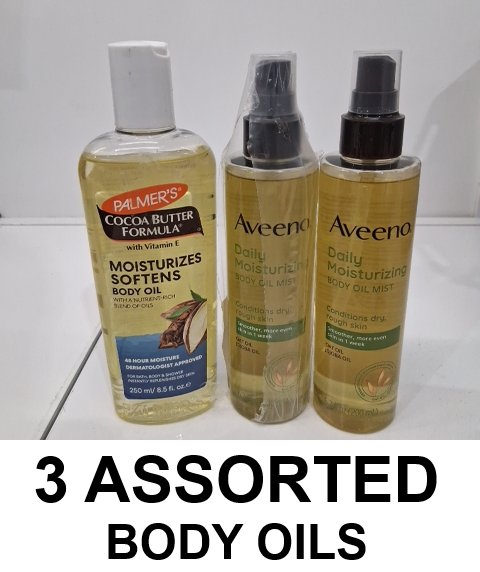 3 ASSORTED BODY OILS - Aveeno daily moisturizing body oil and palmer's moisturizing softens